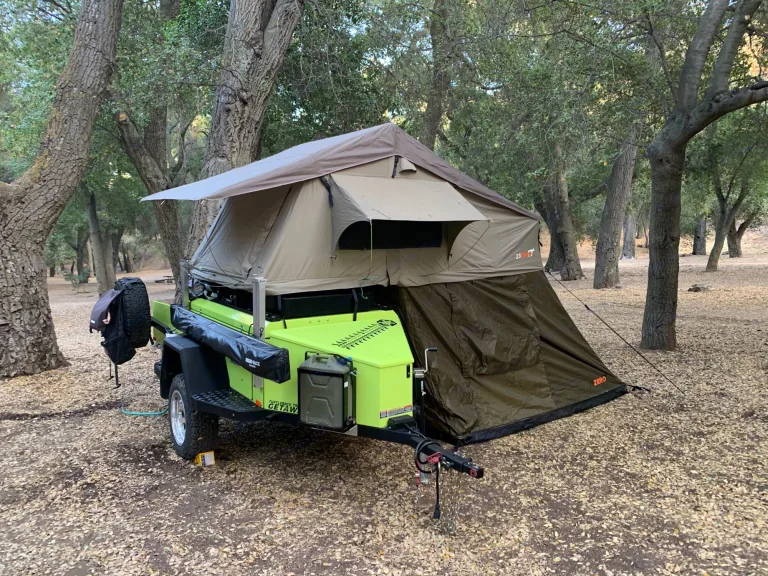https://youtu.be/Lukk3qxBLgoThis Turtleback Getaway includes ALL the options from the factory in Phoenix, AZ. It weighs about 1,600 lbs, so it is towable with a Jeep or small SUV. The included Max Coupler hitch provides smooth, quiet towing even on uneven roads.Signature suspension with Icon shocks soaks up rough roads so you won't have the trailer bouncing around behind you.Features: