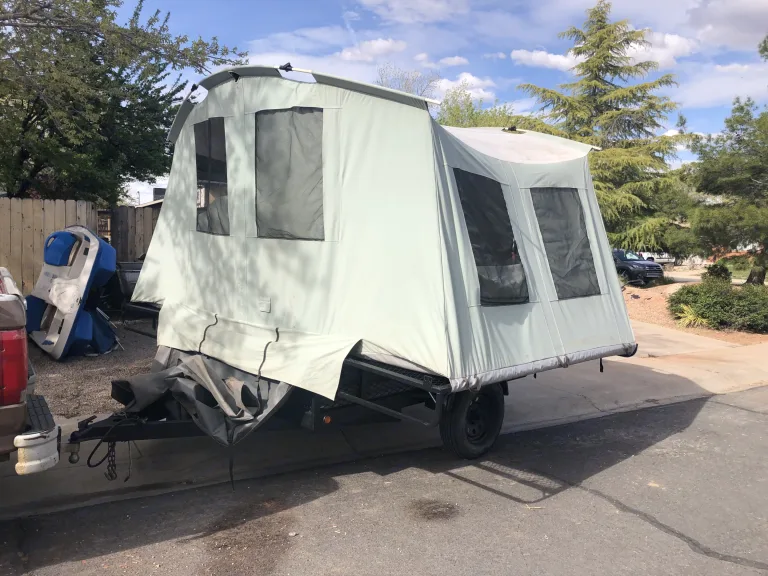 The 6x8 Jumping Jack is a "Jump up" tent trailer with the ability to put 2 four wheelers or one UTV on top. Similar to a canvas wall tent but it sets up in less than a minute if your good at it! It has a table and sleeps 4 in beds and has room for 2 more on the floor if needed. There's not much to them but you can take them anywhere!