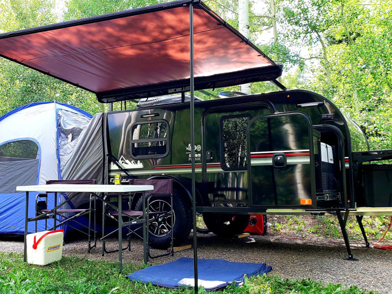 This amazing little trailer is perfect for a weekend escape or extended road trip. Weighing under 2,000 lbs, it can be pulled by most small SUV's or medium sized cars. It is equipped with a 2-inch ball hitch and 7-pin connector. If you have a 4-pin connector, an adapter will be needed. The trailer also has a 1-inch lift kit and off-road tires, so it can roll through more rough terrain.The Pursue is designed to be plugged into a 30-AMP outlet that you find at most RV Parks or Reserved Campgrounds (plug-in cable provided). It also has the ability to run via internal battery, but will not have enough power to run A/C-Heater. I do also have a 2000-Watt generator that can be plugged in, but it is still not enough power to run A/C-Heater. (Generator provided). There is a built-in roof Cooling/Ventilation fan that works great and can keep the trailer a comfortable temperature in the summer months. The battery/generator options are perfect for dispersed, off-grid camping.The trailer can sleep 2-people on a full-sized mattress with foam pad. A Coleman 4-person tent can be attached to the back and used as additional sleeping space, a living area, or a place for your pets to stay. You will need to provide your own sleeping bags or blow-up mattress for the additional sleeping space. (I do provide linens, blankets, pillows for inside trailer use only)The slide-out kitchen sets up in just seconds. It contains a two-burner stove, a storage cabinet, a 12-V refrigerator, and a detachable table that creates a small counter space for meal prep. (I do provide all kitchen cookware, eating utensils/dishware and cleaning supplies).The Flyer has a 2” receiver, rated at 175-lbs, attached to the rear of the trailer, so bring your bikes along on your next big adventure! (I do have a 2-bike rack to use for an additional charge.)Extend and secure the awning to complete your mini home-away-from home patio.NO Bathroom, Shower, or Running WaterNo festivals or concerts, sorry.What's includedGreetings!Here's what you get: