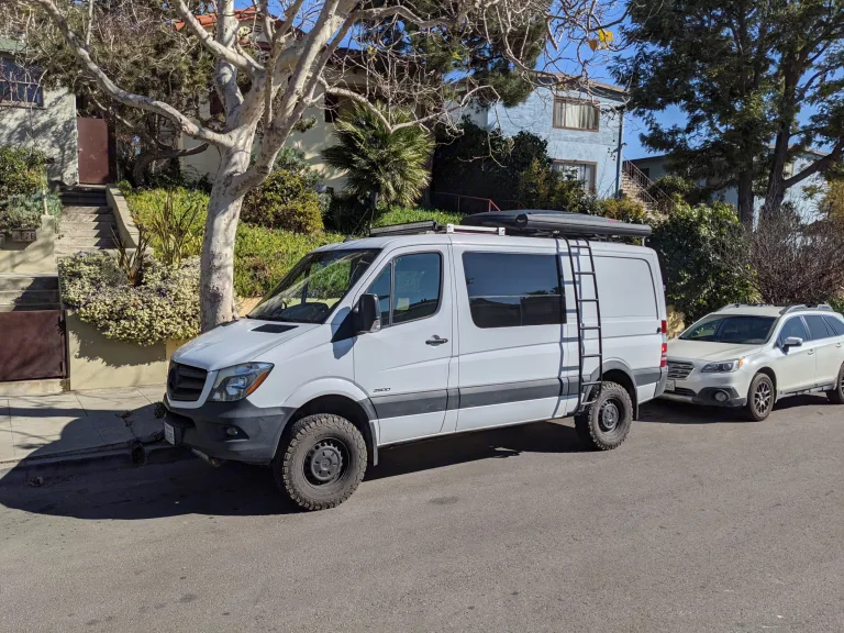 2016 Sprinter 2500 144 4x4 Low Roof w/ HeaterCan be configured for driver and passenger seats only (2 seatbelts) with a couch in the living area OR a double seat in place of the couch that adds 2 additional seatbelts for 4 total passengers.A side ladder gives access to the Yakima roof box to bring surfboards, 4-6 pairs of skis, or 4 snowboards.Roadshower 4L mounted on roof with interior plumbing to rear storage area.Sleeps 2 in a full size bed.KEY Features
