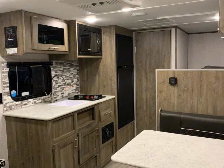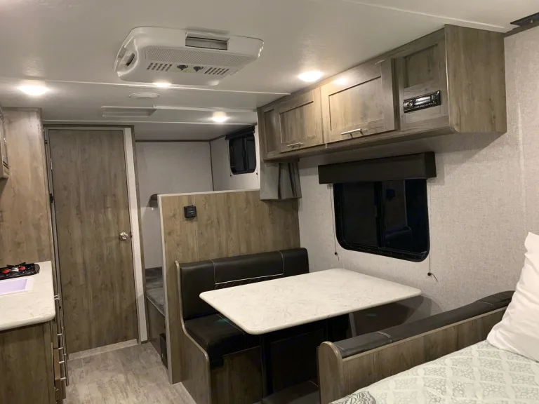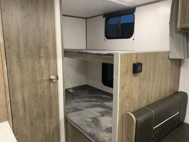 Super light-weight, enough to be towed with a mini van or small SUV, and still enough room to sleep 5-6. Your family and friends will camp in comfort. Queen bed in the front with bunks in the rear and dinette converts into a bed that sleeps 2. This trailer has all you need to have a great vacation. Fully stocked kitchen, bedding, cleaning supplies, portable bbq, in addition to much more!•Tow vehicle is required to have a 7-pin trailer connector and an electric brake control (we have a Bluetooth electric brake to rent if needed)•Absolutely no smoking, pets, or vaping•No climbing on the roof•Please only only use RV toilet paper, which we provideWhat's includedOutdoor bbq, outdoor rug, cleaning supplies, fully contained kitchen, bedding