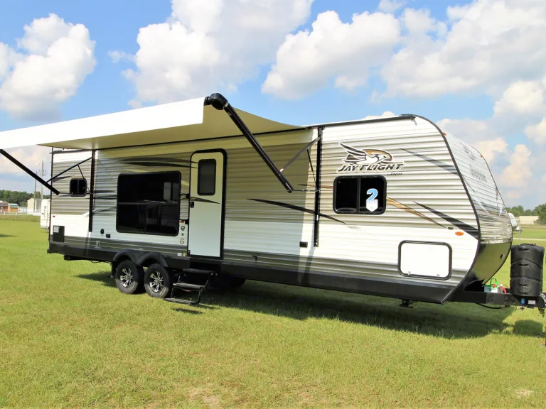 Start Relaxing and Glamping as soon as you arrive at your destination. If you have the camp site we can deliver and set up so you avoid the hassle of towing and hooking everything up. You will love camping in the lap of luxury in this home away from home!This unit features a unique rear kitchen floorplan rarely seen in a travel trailer, it is equipped with an electric awning with LED lights, electric slide out for ample living space, residential height master queen bed with mattress topper, 30 and 50 amp electrical connection, full R-7 insulation, four season weather package. Fully stocked kitchen with all appliances/pans/utensils/gadgets needed for cooking a gourmet meal, large fridge and freezer, cupboards stocked with essentials, large kitchen peninsula for prep and serving, freestanding dining table and 4 moveable padded chairs, LED interior lighting, info control center, outdoor shower, outside speakers, cable TV hookup, kitchen skylight with shade, 32" LED TV, surround sound entertainment system with AM/FM/CD/DVD and Bluetooth connectivity, comfy leather recliners and sofa which converts to a full size bed. Powerful AC and heating system, smoke detector, CO2 detector, and fire extinguisher, privacy blinds and tinted windows. Abundant storage, private lockable doors to bathroom and bedroom, two closet wardrobes and additional storage over bed, large bathroom with residential 5 function variable flow massaging shower head with 5' hose, skylight, ceiling fan, lots of extra towels (including beach towels), floor to ceiling storage cabinet. Large front storage space under bedroom. Can sleep 6 with an air mattress for two on the floor or use recliners as well. Brand new bedding and towels. Lots of windows throughout for light and large side windows for taking in the views. Plan on campsite pampering in this beautiful gem of a trailer.Welcome gift included.