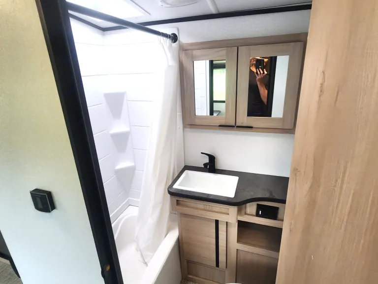 The kids will be begging you to go camping every other weekend in this bunkhouse model! They will have three bunks to choose from, plus a dinette under one bunk where they can draw or play a board game at. The large slide out in the main living area opens up this space so the cook can prepare lunch easily, and your guests can relax on the tri-fold sofa or booth dinette. There is also an outside kitchen so you can cook breakfast as the sun is coming up! You and your spouse will love the front private bedroom with its sliding king bed for all-around comfort and convenience!Enjoy full featured luxury camping in a Radiance Ultra Lite travel trailer by Cruiser! These lightweight units feature Azdel composite laminated walls, a 6' 11" barrel roof, and 5-sided aluminum construction for a strong, sturdy RV made to last. You will also appreciate the patent pending Full Belly Storage for all your gear, and the painted, fully molded fiberglass cap for a clean sleek look. The inside will be easy to keep clean since there is no carpet throughout, and the black-out roller shades in the living area will provide privacy when the campground is busy. Each model includes seamless countertops throughout, plywood flooring, plus more drawers, cabinets, and cubbies for all your belongings. These models also include a dual ducted A/C system to keep your comfortable, a patent pending king bed slide system, and industry-leading ceiling heights to make you feel right at home!Sorry no pets, I've never made an exception, so please don't ask.