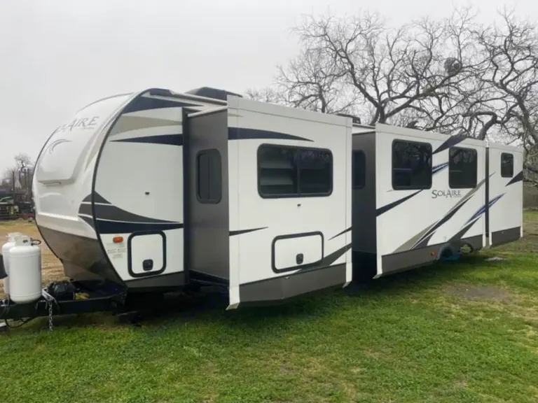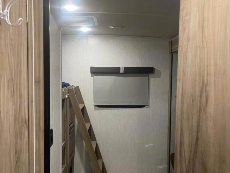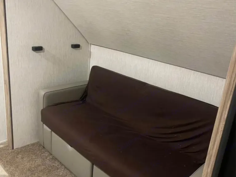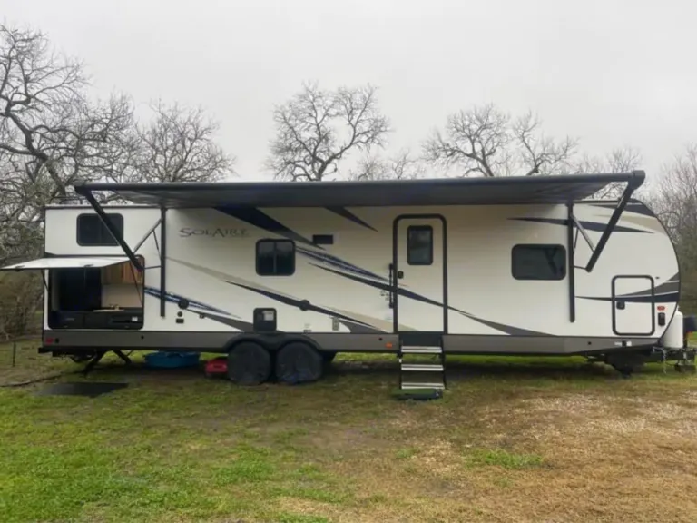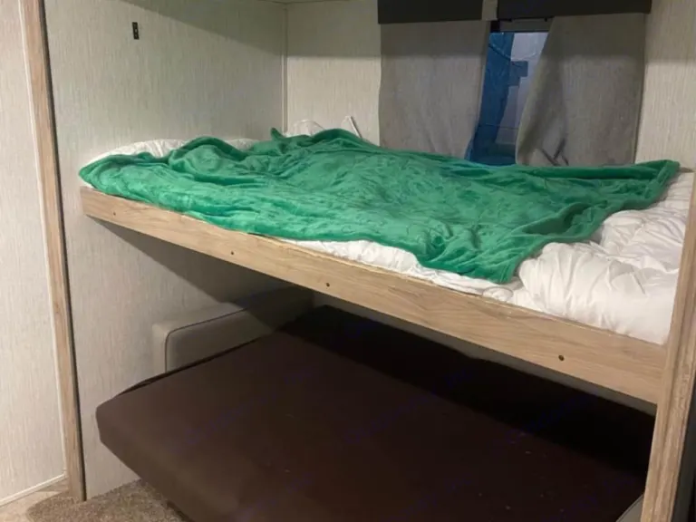 In the rear of the cabin, there is a set of bunks The bathroom has a stand up shower and a flushable toilet. There is a small sink and a linen closet for additional storage in the bathroom.You will surely be able to relax underneath the power awning and enjoy all your outdoor and evening activities. There is additional outdoor storage space for your camp chairs, games, and other accessories.You can pick up and return this bunkhouse to us, but you will need a 2 5/16” ball and a 7 blade plug for towing, or you may be able to rent ours for a fee.We offer full delivery, setup, and return services, which are free within 30 miles of us in Schertz, TX. We can also deliver to more distant locations for $3.00 a mile with a $150 minimum charge. This is a one time charge per rental based on the one way distance to the destination.If this bunkhouse does not meet your needs, please ask us about other options available in our fleet of RV and campers.20% surcharge will be added to rentals less than 3 nights.We are proudly Army retired, Veteran owned and offer a 10% discounts for active, reserve, and retired military as well as first responders! We look forward to meeting you!What's includedFree delivery and set up within 30 miles of me in Schertz. TX. We can deliver to further locations for a fee.Pots, pans, dinner ware, sliver ware, serving ware, coffee maker, cleaning supplies, hand soap, dish detergent and RV toilet paper. RecommendationsAsk a out our fully stocked option where we provide fresh bedding and towels for a hassle free stay.Check out our weekly and monthly rates. Other things to note20% surcharge will be added to rentals less than 3 nights.