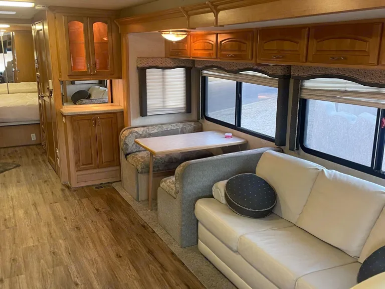 The RV has four slides, two expand the living room and kitchen area and two expand the master bedroom.
