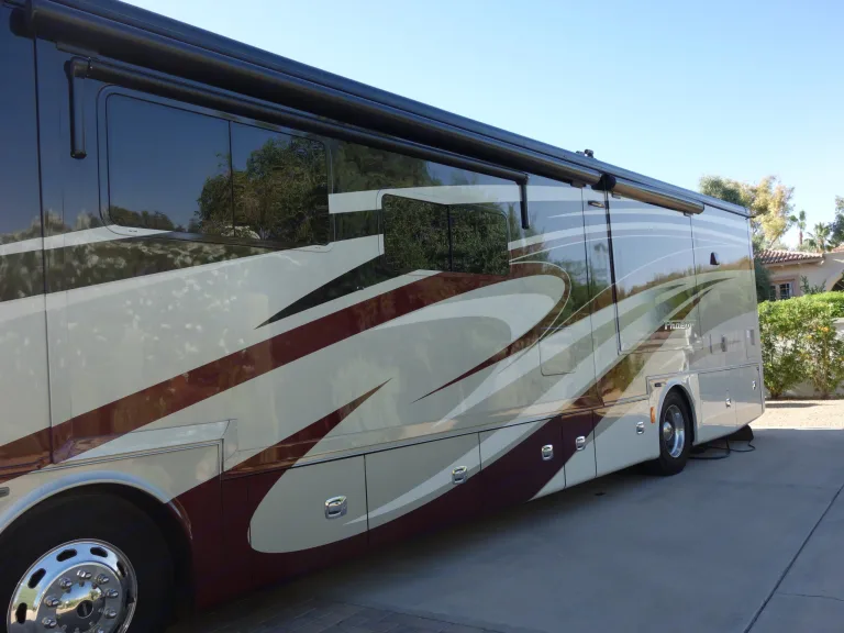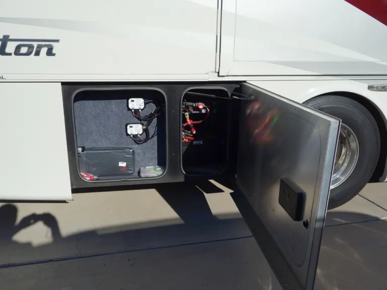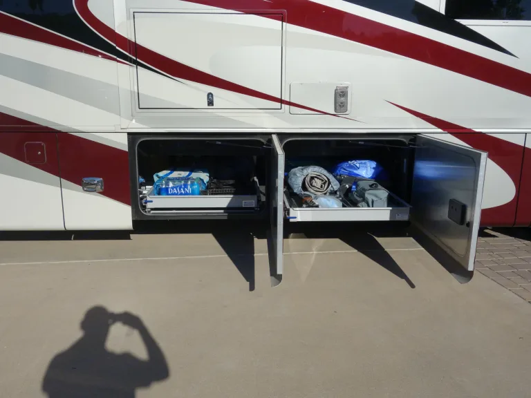 Camping chairs and propane grill included. Bike rack available. Tire pressure monitors. Garmin RV890 navigation. Koni shocks with Safe T Plus steering control. Heated floors. Mobile eye. Satellite radio. 4 TV's including outside patio TV. Large electric patio awning. 2 Storage trays for easy storage access.