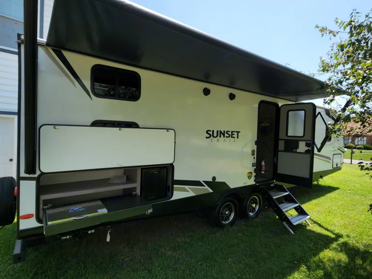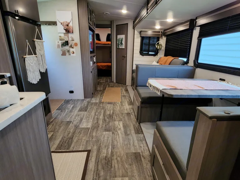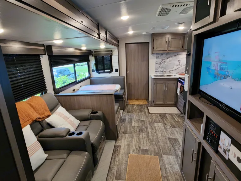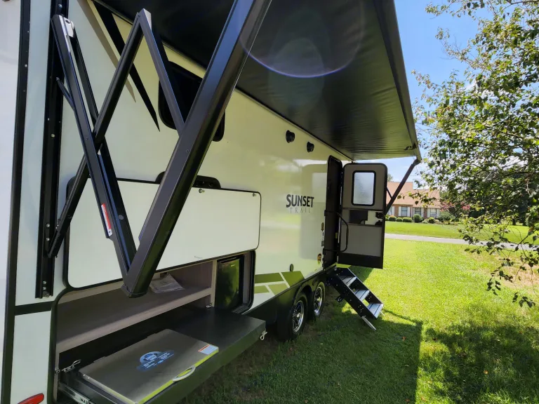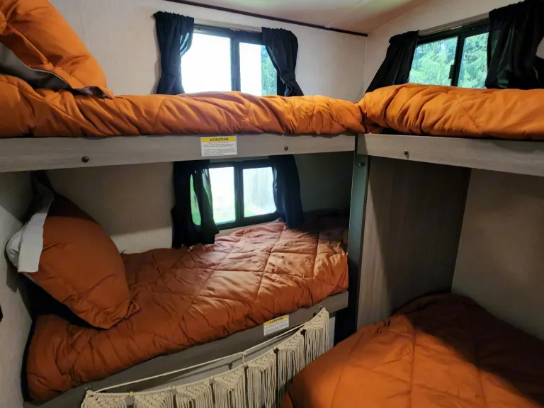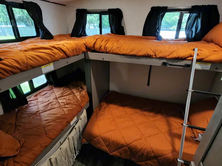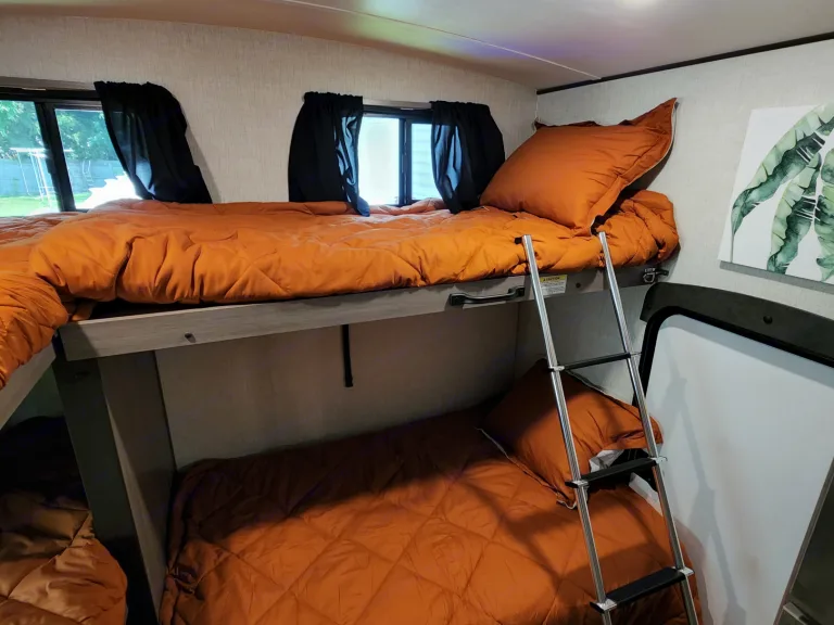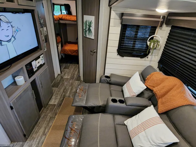 @Max Your Journey!.WE Have 2 Units Just ASK. Comes ready to camp just bring your own food and bedding(Available if selected) . Has a King size master bed that's glamping. Sleeps 9, 7 comfortable and is a super lite trailer. 6230 dry weight. Pet friendly with a small fee will lose deposit if pet damage or pet is in rv with out approval. Also must have my tanks empty when returned. The bunk house has 4 bunks (3 Twin XL) , 1 Jack Knife sofa that converts to a bed. One flat screen. Delivery is available. $300 flat rate includes set up and pick up to 70 miles. Come on now you wont have to break a sweat just the seal on a cold one, ill have the AC already on for you. Grey tank indicator must read empty upon return $80+ fee. Camper includes big outdoor rug, chairs if needed, folding table, toilet paper, some cups and paper plates, basic seasonings, propane ,cable hook up capable, some cleaning supplies, . Plus plenty other extras. Only Delivery NO Towing. Questions please ask. Generator is also available for a small fee very helpful when camping at no hook up sites, and its a super quiet model.