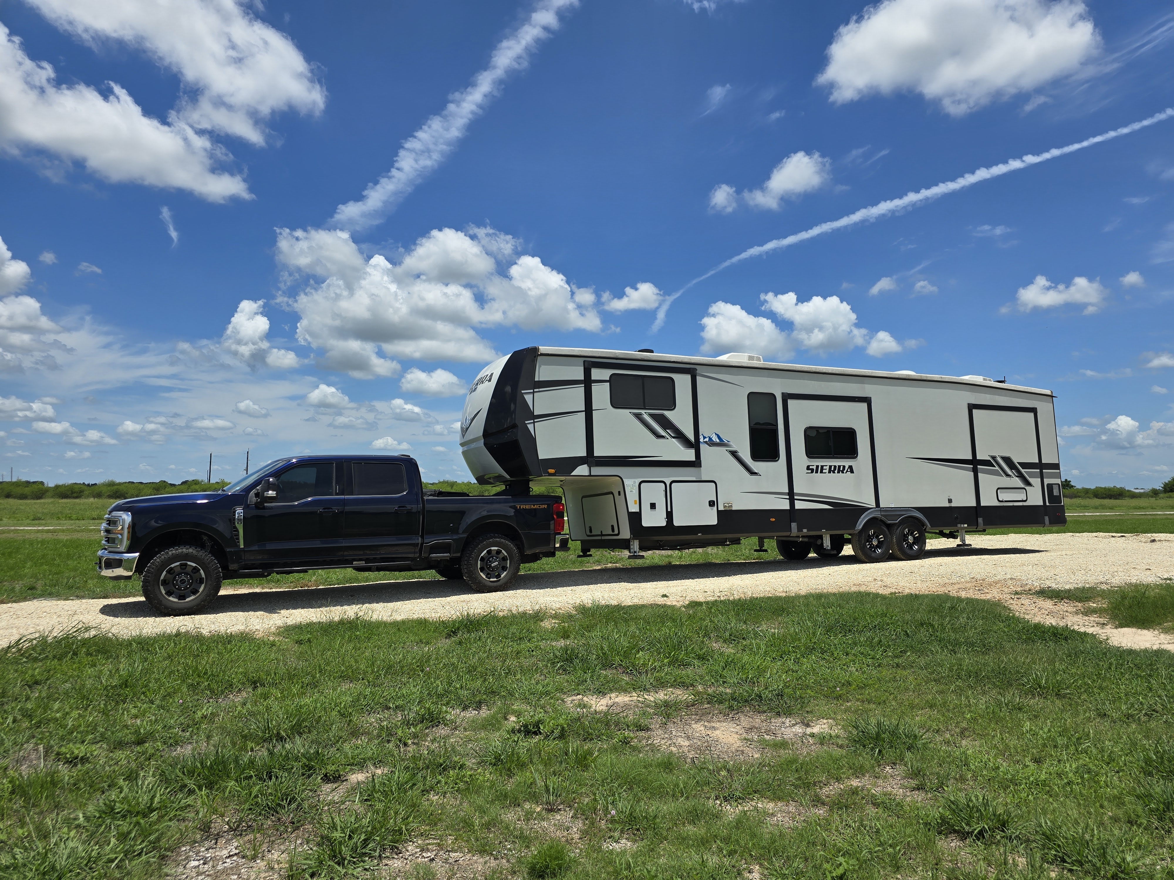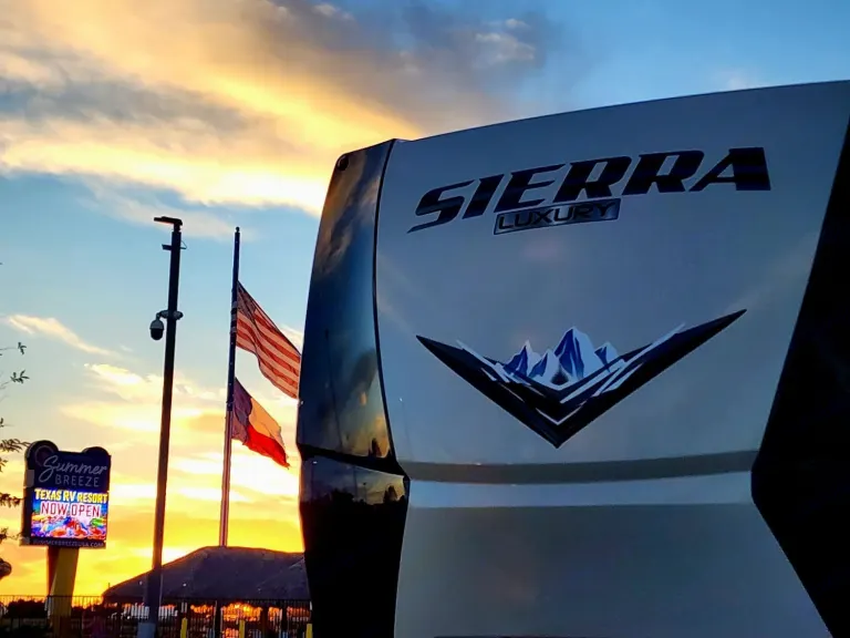 Large open living space offers plenty of room for the entire family.Relax and watch tv (60" TV in the living area) with dual recliners.Residential fridge / freezer with enough room for all your groceries in one trip.Great out door kitchen with small gas grill and a small sink.Rear bathroom has outdoor access so people don't have to go through the interior to get to a bathroom if they are dirty, sandy etc.This like new trailer has a large awning, LED awning and cap lights , and outdoor speakers for amazing out door comfort while hanging at the campground.Continuous on-demand hot water heater so the whole family can get showers in without waiting between.Dual air conditioner units to stay cool even on the hottest ( and humid Texas !) summer days !