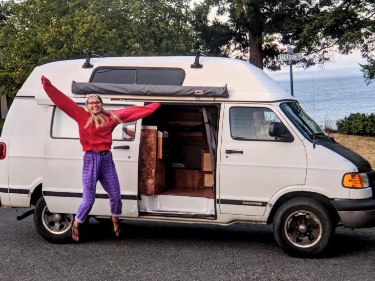 Conversion van with bed, sink, table, plenty of cupboards and storage space. My 20 yr old was living in it while going to UW in Seattle but was hit by car while jogging so is unable to live in her van for about a year. It is great for in the city and short trips like hiking excursions. Wouldn’t take it across the country.