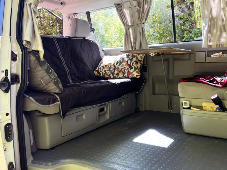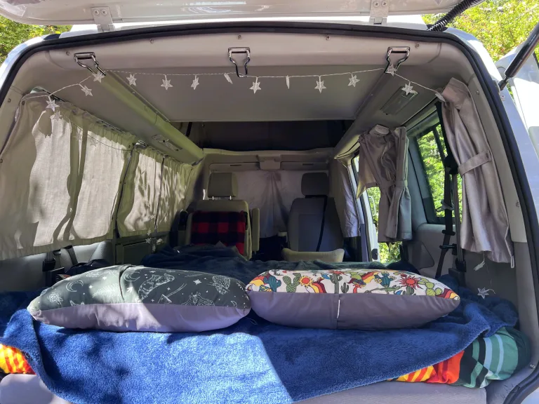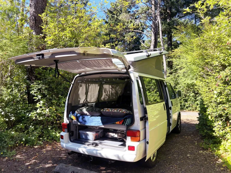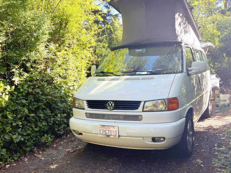 Camp below the alpine meadows of Mount Rainier. Soak in the sights of the wild Washington Coast and the Olympic Mountains. Take a cruise through epic mountain valleys to visit Leavenworth, a mountain biker and climber’s escape. Enjoy hot coffee as you shelter from the rain of the iconic Hoh Rainforest.Enjoy all this and more in this spacious, comfortable 2003 Volkswagen Eurovan. This iconic van is roomy enough to seat seven, featuring two rear-facing chairs behind the driver and passenger seats–the seat behind the passenger can be removed and the passenger seat swivels. Fold out the kitchen table to cook a hot meal, or extend the back seats into a padded queen bed for a rest. With an iconic pop-top roof, this van can comfortably sleep four people–two up top and two below. We also include a two-person tent for those wanting to sleep under the stars!Let us know and we’ll clip on a bike rack for your mountain biking excursions, free of charge. We also have a paddleboard and foldable kayak (with optional fishing rod holders) available to rent for aquatic adventures! Bring your pup along for the ride–we’ll include water and food bowls, a dog bed, a moisture-proof fold-out mat, and paw wiping cloth.While we ask that you stay away from off-road trails, this van is perfectly equipped for other camping adventures. Go off-grid while charging your devices using the van’s solar-powdered battery, and service all your cooking needs with a 5 gallon Aqua-Tainer as well as a collapsible kitchen table, dishwashing sink and cold water pump shower. We’ve also provided a stove and fuel, kitchen amenities, utensils, oils and seasonings, as well as sheets, blankets, pillows, and toiletries.We hope you enjoy exploring our beautiful and wild state!What's included• Stove and fuel
