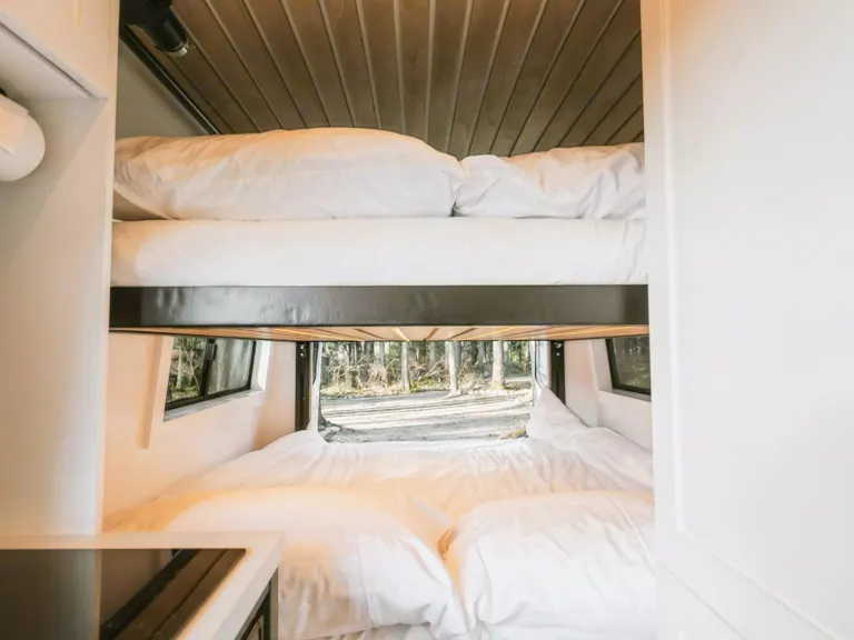 Our vans were built for boondocking with a view.To go off grid we have 412 amp hours of Lithium Iron Phosphate (LifePo4) batteries, 700W of solar power, batteries that charge as you drive, 44 gallons of water, and a dry flush toilet.We also have 6 bunk windows providing you with views almost everywhere you look.Other things to note