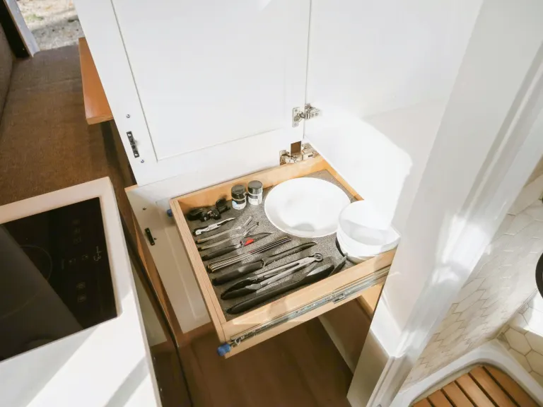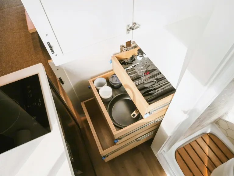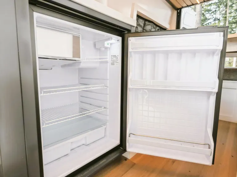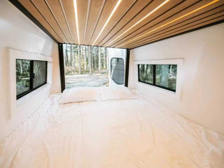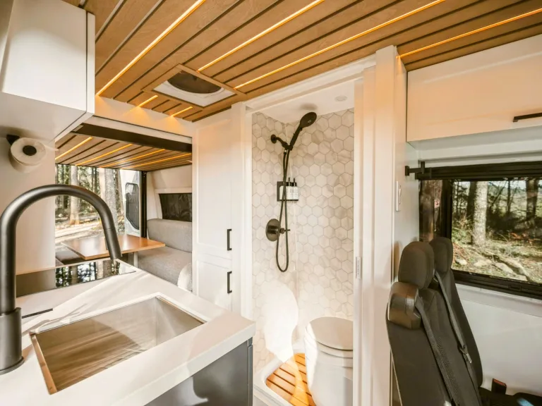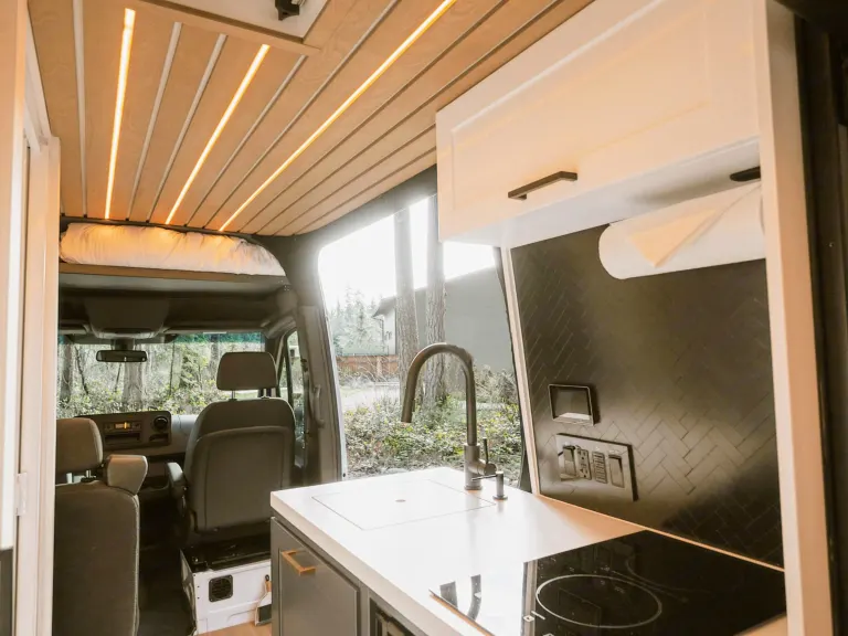 Full Kitchen - The kitchen includes a 2 burner induction stove, 130L countertop height refrigerator and freezer, Keurig coffee maker, full size kitchen sink, cookware, and utensils.Full Bathroom - You won't compromise hygiene in our vans. Stay fresh with complimentary Beekman 1802 products and enjoy a hot shower after a long hike, plenty of fresh water, and a private area to relieve yourself.Queen Size BED - Sleep soundly on a hotel quality queen 5” memory foam mattress, which is the same width as a queen but the length of a full size mattress.Full Size bed - Our Village Nomad features a near Full Size bed that automatically drops down from the ceiling, allowing 4 guests to sleep comfortably. The bed is roughly 50"x70".Work From Anywhere - A T-Mobile 5G Hotspot keeps you connected on the go.60" Projector - Stream your favorite movies and shows in style. Our Village Nomad features a 60" indoor/outdoor projector.Climate Control - No need to bundle up, a forced air heating system and best-in-class insulation (we use the same insulation as Arc'teryx, just more of it) keep you warm at night in the winter. For the summer, our vent fan and 4 slider windows will provide plenty of air circulation to keep you cool.Storage - We feature a large wardrobe cabinet, 2 upper cabinets, 1 drawer, and a large storage cabinet in the rear of the van to store all your gear.Instagram Worthy Design - Our Village Nomad features a modern, trendy design with Oak, Navy, Black and White, with accents of gold.What's included: