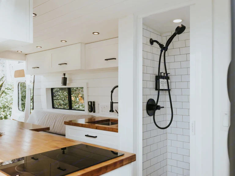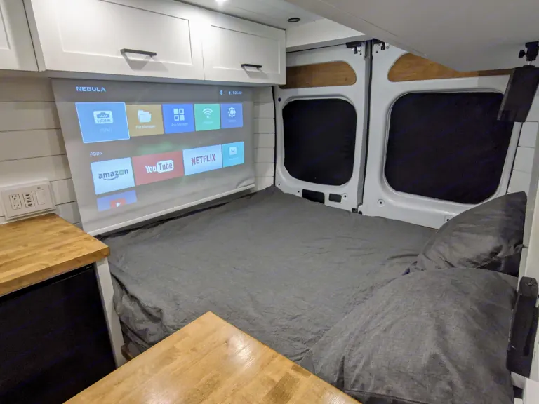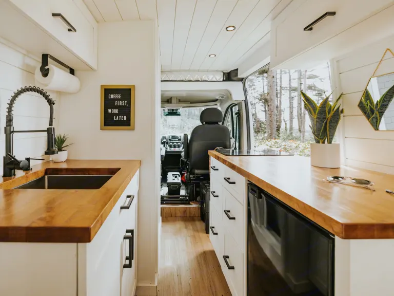 Full Kitchen - The kitchen includes a 2 burner induction stove, 130L countertop height refrigerator and freezer, Keurig coffee maker, full size kitchen sink, cookware, and utensils.Full Bathroom - You won't compromise hygiene in our vans. Stay fresh with complimentary Beekman 1802 products and enjoy a hot shower after a long hike, plenty of fresh water, and a private area to relieve yourself.Queen Size BED - Sleep soundly on a hotel quality queen 5” memory foam mattress, which is the same width as a queen but the length of a full size mattress.Work From Anywhere - A T-Mobile and/or Verizon 5G Hotspot and our commercial fleet WiFi Booster keeps you connected on the go.55" Projector - Stream your favorite movies and shows in style. Our vans feature a hidden, automated, drop-down projector along with a 55" projector and integrated Chromecast.Climate Control - No need to bundle up, a forced air heating system and best-in-class insulation (we use the same insulation as Arc'teryx, just more of it)keep you warm at night in the winter. For the summer, our two vent fans will provide plenty of air circulation to keep you cool.Storage - We feature a large kitchen cabinet, 3 pullout cabinets, 6 upper cabinets, and a 2 cubic foot storage unit under the bed for your valuables.Instagram Worthy Design - Our vans will feel like home with our cozy, modern farmhouse style. Don't settle for less when you can camp in a luxury home on wheels.What's included