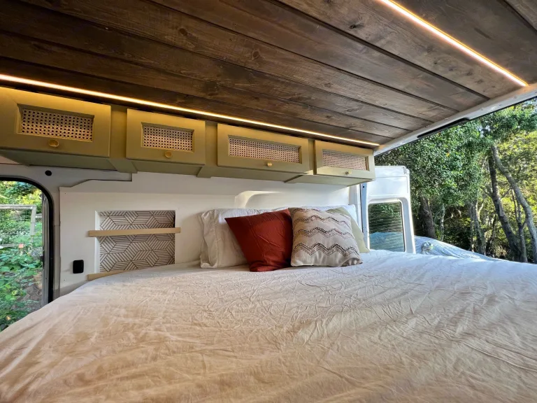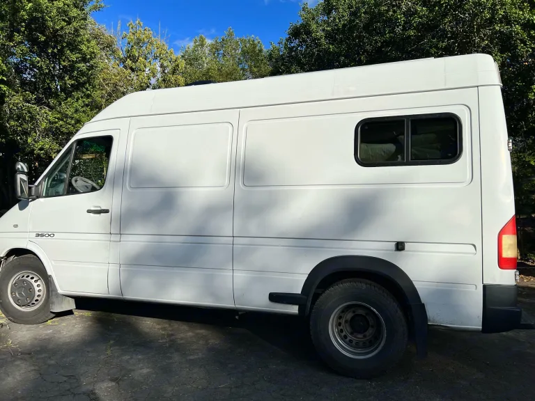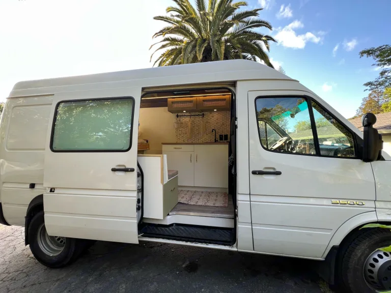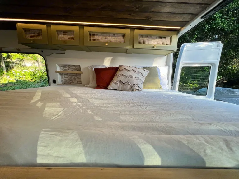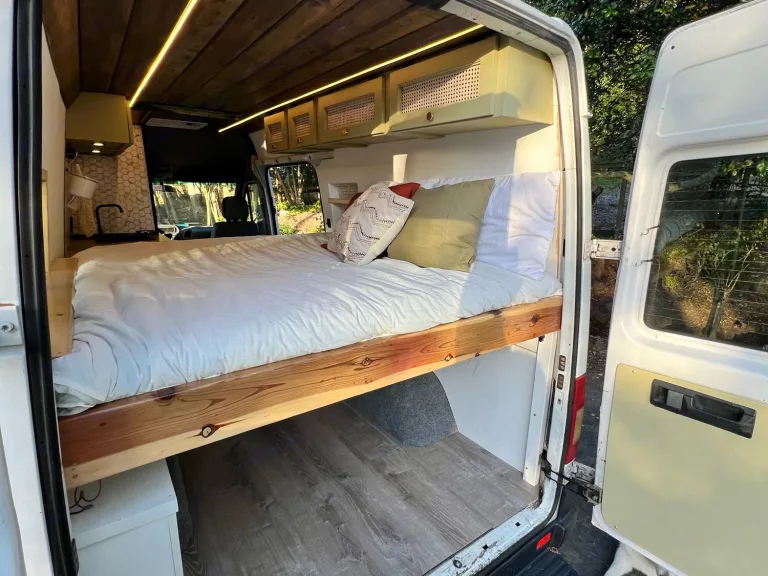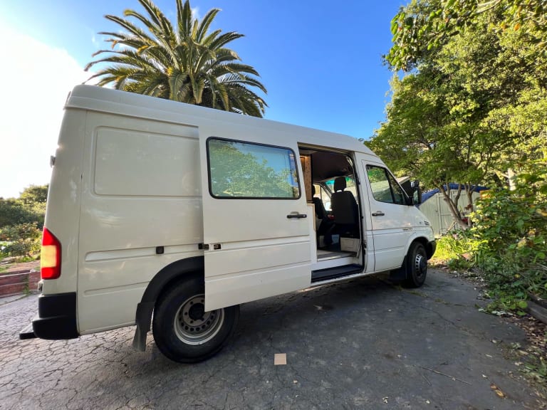 Newly built white Mercedes Sprinter van with dually wheels for more stable drives and newer tires! Betsy Bee is a sunset dreamer!This van was is equipped with a new cozy memory foam mattress (slide out) queen bed,