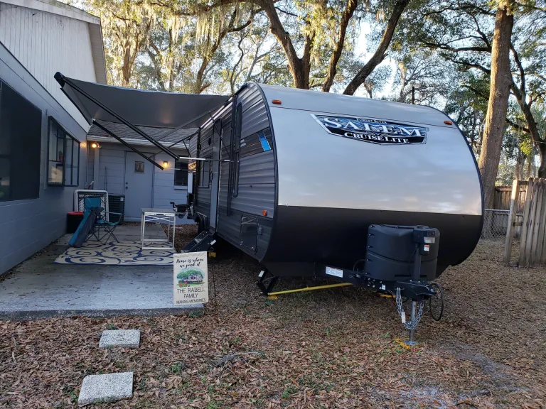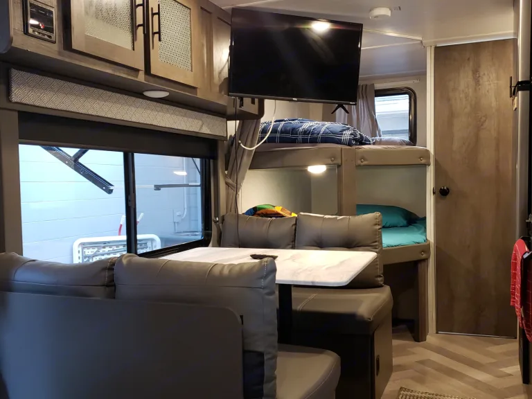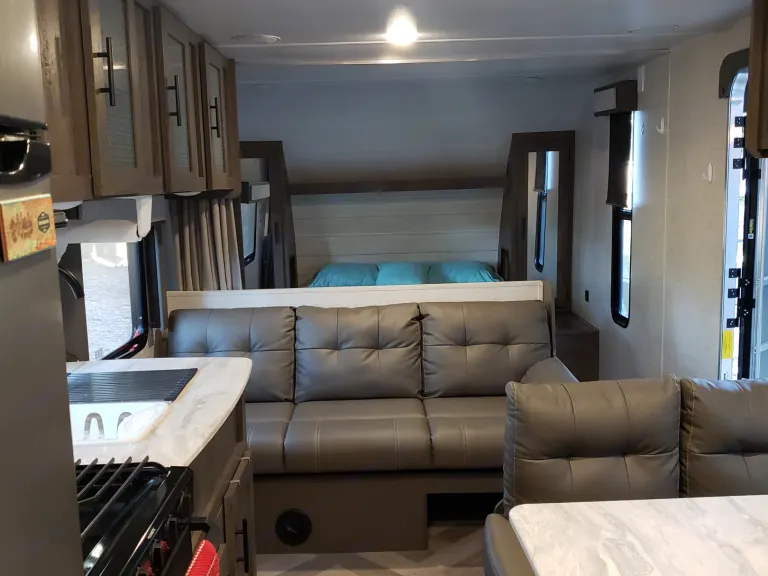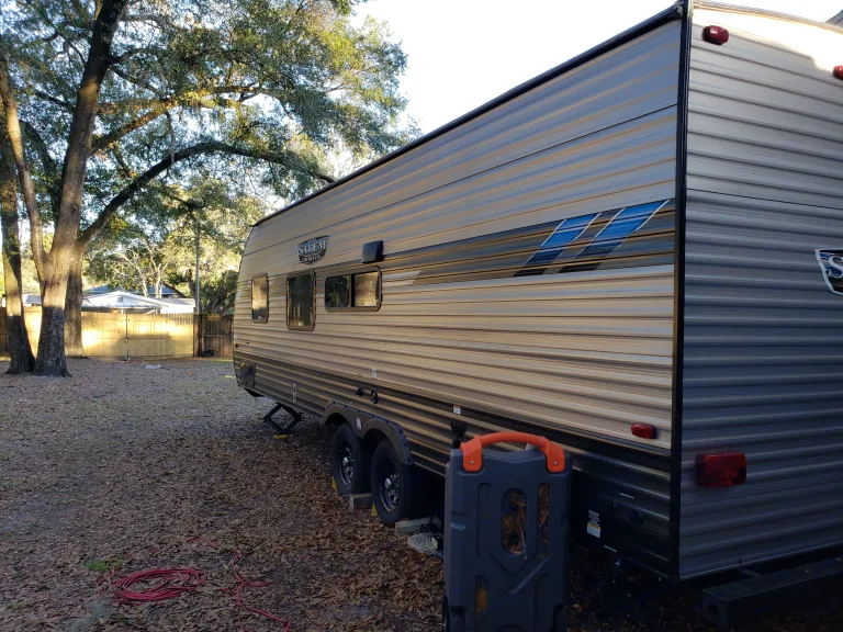 29ft trailer that sleeps 8 comfortably, 1 queen bed with a curtain for privacy. A bunkbed at the opposite side of the trailer with 2 beds that also have curtains each for privacy, a dinette that converts into a bed and a jackknife sofa that also could sleep 1 adult or 2 kids. A bathroom with a skylight, along side a small shower/tub. Full kitchen with nice size refrigerator, microwave, 3 burner stove with an oven. Dual sink with a window in front for a nice view. Large awning with speakers that connect to any bluetooth device, outside there is also a small refrigerator and a small gas grill. The rental will come with an outdoor mat and 3 chairs for your convenience, along with plates, cups and utensils (set of 4). Rice maker, coffee maker, toaster, 1 small pot , 1 square pan. Linens for queen bed and twin bunkbeds are provided, if additional bedding is required please let us know. Toilet paper also provided. Smart TV. We can provide a portable waste tank (21 gallons) if the location does not have sewer hook up. Delivery, Set up and pick up to/from the location can be done for up to 60 miles, If you are towing the trailer you must have the proper hitch and weight distributor for safety.What's includedThe rental will come with an outdoor mat and 3 chairs for your convenience, along with plates, cups and utensils (set of 4). Rice maker, coffee maker, toaster, 1 small pot , 1 square pan. Linens for queen bed and twin bunkbeds are provided, if additional bedding is required please let us know. Toilet paper also provided. Smart TV. We can provide a portable waste tank (21 gallons) if the location does not have sewer hook up.RecommendationsWe are close to Thononossassa State Park and only 1 hour away from Disney.Other things to noteNo smoking inside trailer