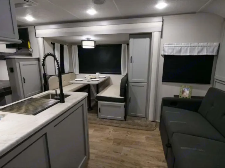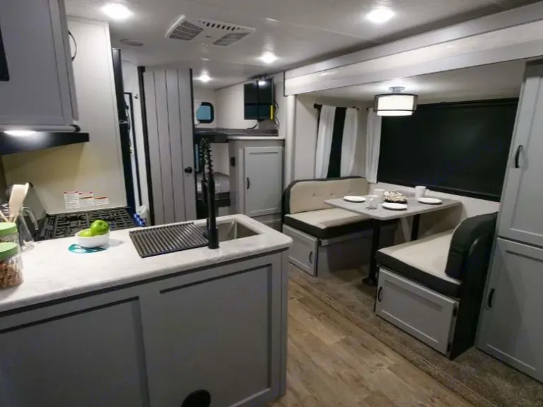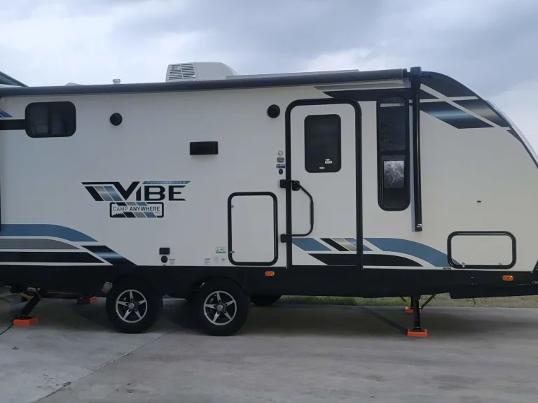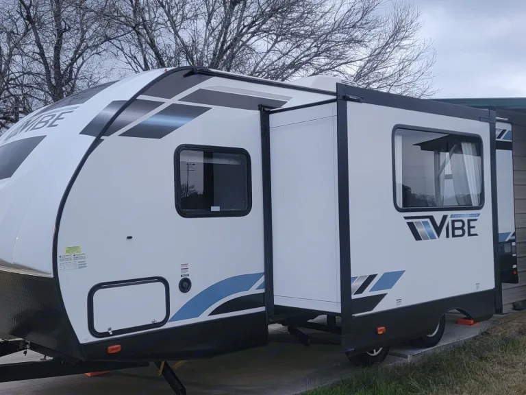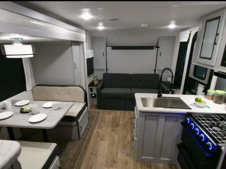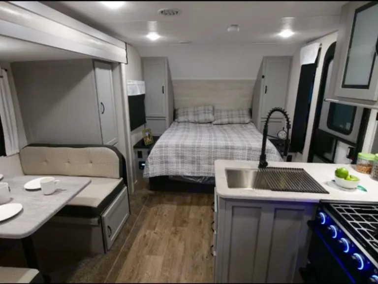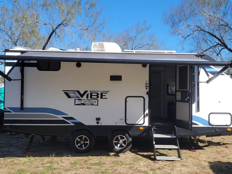 Get your adventure vibes on in our 2021 Vibe Travel Trailer! This is basically an AirBnB on wheels. Rental comes with queen bed linen, throw pillows, towels, cooking equipment/utensils, plates, cups, coffee mugs(4), coffee maker, microwave, etc. This is a fantastic new trailer with all the bells and whistles. Easy to pull and easy to set up. Very cute, modern interior with comfortable amenities such as murphy bed(Linen included for queen size bed) and reclining couch facing the TV. Nice interior kitchen in addition to outdoor cook top, sink, and fridge! It also has a lovely walk in shower and outdoor shower. Oversized bunks and convertible kitchen table to additional bed(Linen not included). Trailer brochure says it fits 8 people. There are 3 beds; queen, 2 fulls, and convertable table to bed. So will be a little tight unless most the individuals are children. This trailer has the Infinity Package which includes many upgrades, including black out shades, power awning with LEDs, TV, Sterio, and kitchen appliances.