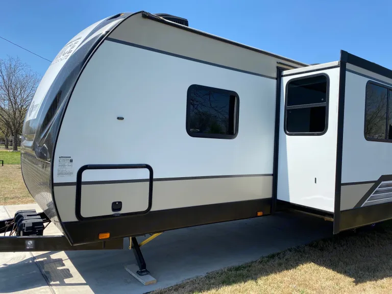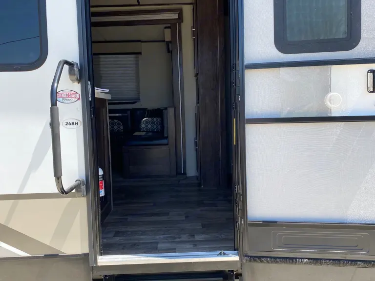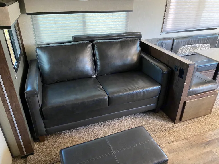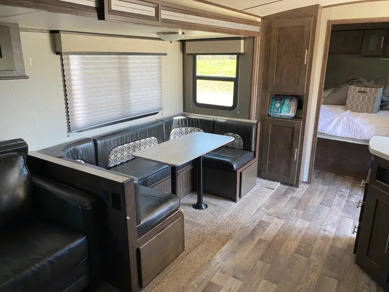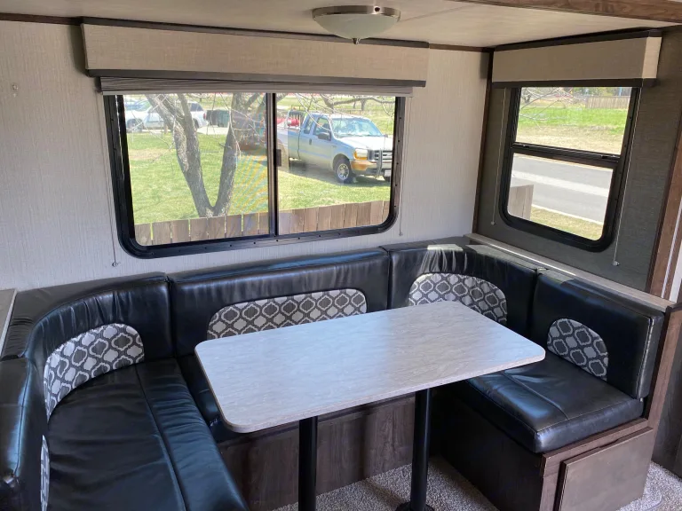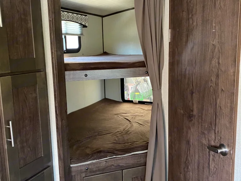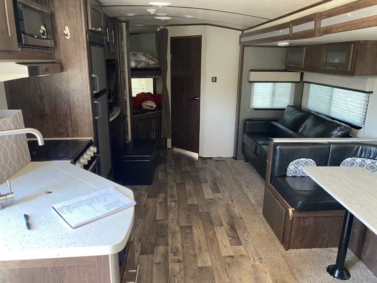 We are a military couple with a dog friendly and kid approved travel trailer available for rent. While we'd love to use it every weekend, that just isn't possible.You'll enjoy a camper with plenty of room to sleep everyone. A king size bed in the bedroom, a bunkhouse in the back, and a kitchen table that turns into a bed...there's sure to be plenty of room for your adventure companions. Other details about the travel trailer include:Air Conditioning