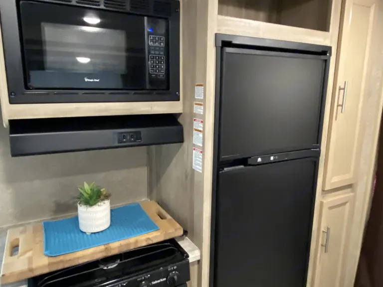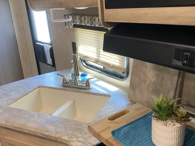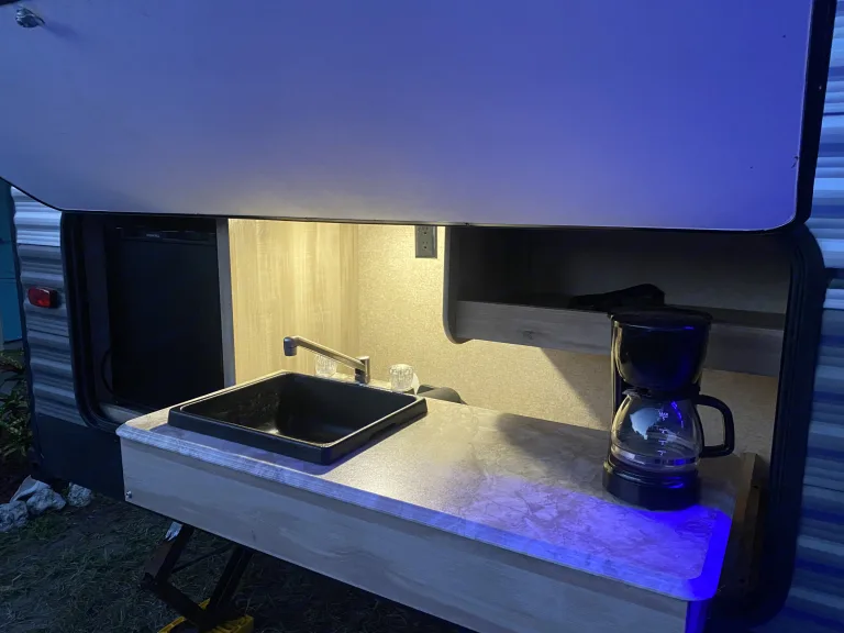 Outdoor Kitchenette: Discover the joy of cooking amidst nature! Our camper comes equipped with a convenient outdoor kitchenette, allowing you to prepare delicious meals while enjoying the fresh air and scenic views. It's the perfect recipe for unforgettable outdoor dining experiences.