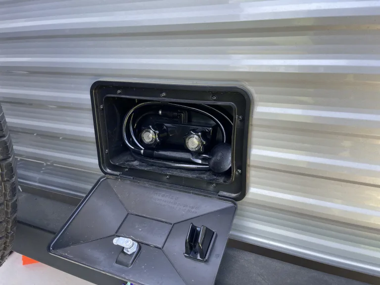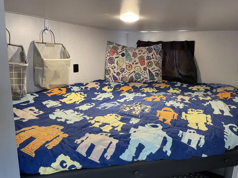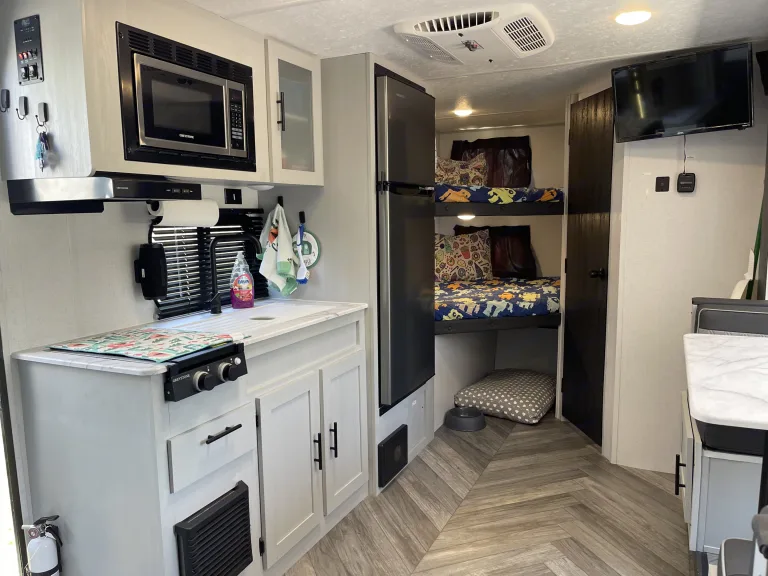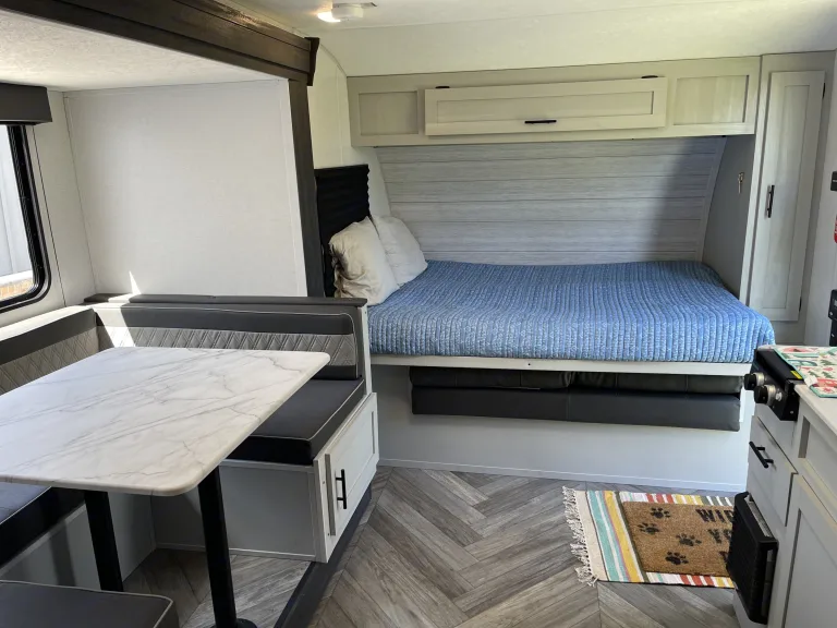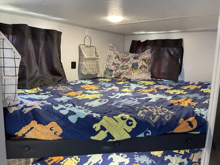Read First: We only offer our camper for delivery and setup by us at this time.We want your family to enjoy the great outdoors in comfort in our cozy camper! All you need to bring, other than yourselves, is your food, clothes, and personal items and we will provide the rest!The camper will sleep 8 people with a queen Murphy bed, full over full bunks, and the queen-sized convertible dinette.The kitchen comes stocked with all the essentials you’ll need, as well as a microwave, 2-burner gas stovetop, and a fridge and freezer. There is also an outdoor kitchen stocked with a propane griddle and mini fridge!The A/C and furnace work great to keep you at the right temperature during your trip!The private bathroom, located at the end of the camper, includes a toilet, sink and vanity area, medicine cabinet, and full-sized shower. We will also provide RV toilet paper, which is the only toilet paper allowed to be used in the camper.We are currently offering delivery only and will have the campsite all set up and ready for you to show up and enjoy!We will either do a quick walkthrough with you in person, or provide a how-to guide if schedules do not align, to show you everything you need to know to enjoy and care for the camper.If you are at a site without sewage hookups, please be aware of the size of the sewage holding tanks as we do not dump during the stay and the tanks can only be dumped by us at the end of the stay.Please no smoking or cleaning any type of fish or wildlife inside the camper.Note: If camper requires extra cleaning upon return, there will be an extra cleaning fee charged. The amount will be dependent upon the condition of the camper and the time it takes to clean it.What's included5 chairs—3 standard camping chairs and 2 nicer chairs with side tables and cooler bags