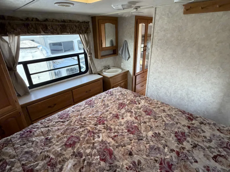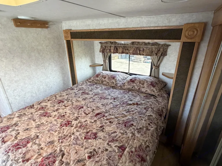 RV rental bedroom featuring a floral patterned bed, window, wooden headboard with shelves, and ceiling lights.. Keystone RV Montana Mountaineer 2004