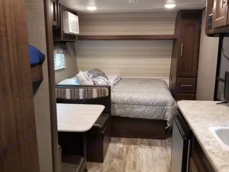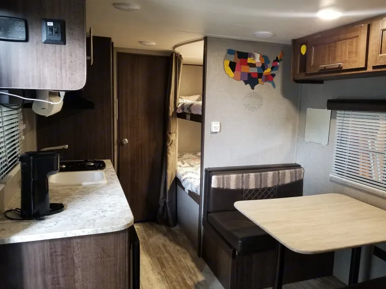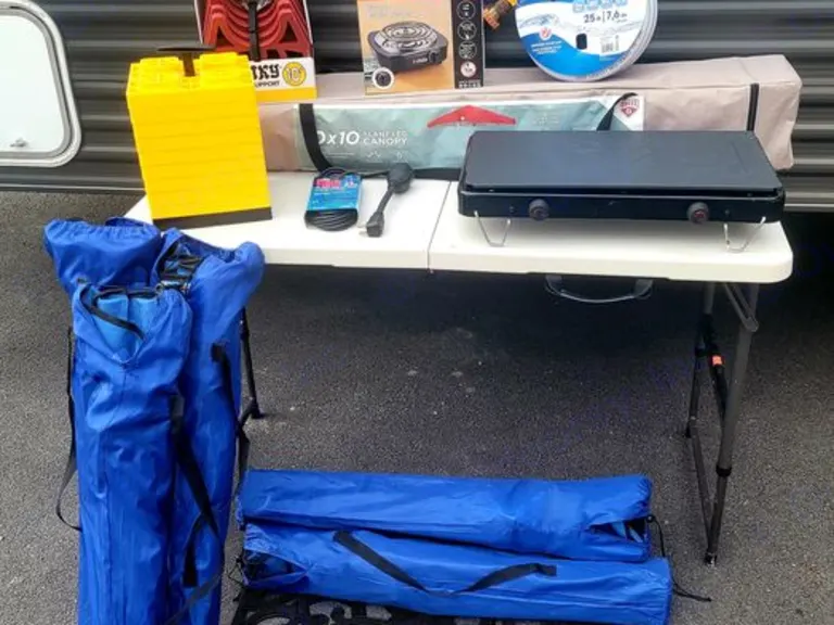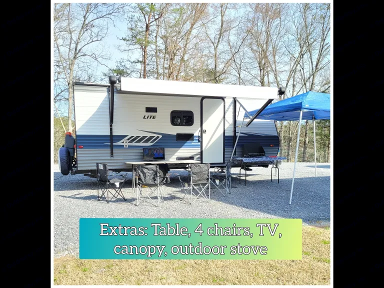 ***7th night Free when you book 6 nights***Check out my other listings on Facebook @ Kellum Creek CampersJust about everything you need to start off your camping trip. 3246 lbs dry weight, 22' long 8' wide makes it easy to fit in just about any camping spot. Very easy to set up and use. Electric jack makes leveling a breeze.Sleeps: 5 adults. Queen bed with new 3" memory foam topper, table folds to a bed, and a set of twin bunk beds. Includes sheets, pillows, towels, & blankets.Amenities: Smart TV with antenna, cable connections, fridge, gas stove, microwave, indoor blue-tooth radio with USB, k-cup & single serve coffee makerYou will need to supply your own- firewood, charcoal, small butane bottles for outdoor stoveDelivery: Delivery, and set up available with flexible scheduleTowing: 7- way connector, 2-5/16 ball, Trailer weighs 3246 lbs, Hitch 520 lbs, Gvwr 4520 lbs Trailer Brake Controller RequiredDRY Camping: Generator Required . If you don't have one you may rent ours. Fresh water tank- 27 gallons, gray water tank- 30 gallons, black tank- 30 gallons. The fridge can run on propane/electric. The stove, hot water heater, & furnace run on propane. AC runs on 30+ amp electricity only. Lights and water pump can run on the batterySpecs: 30 AMP, Height 10' Length 22' Width 8'What's includedFresh Linens, towels, pillows, camping chairs, 10x10 canopy, outdoor butane stove, dishes, utensils, sewer hoses, portable waste tankbif needed, generator (rented), full fresh water tank (if needed), k-cup coffee maker, propane, cable wire, outdoor table (if needed), cleaning supplies, water hose