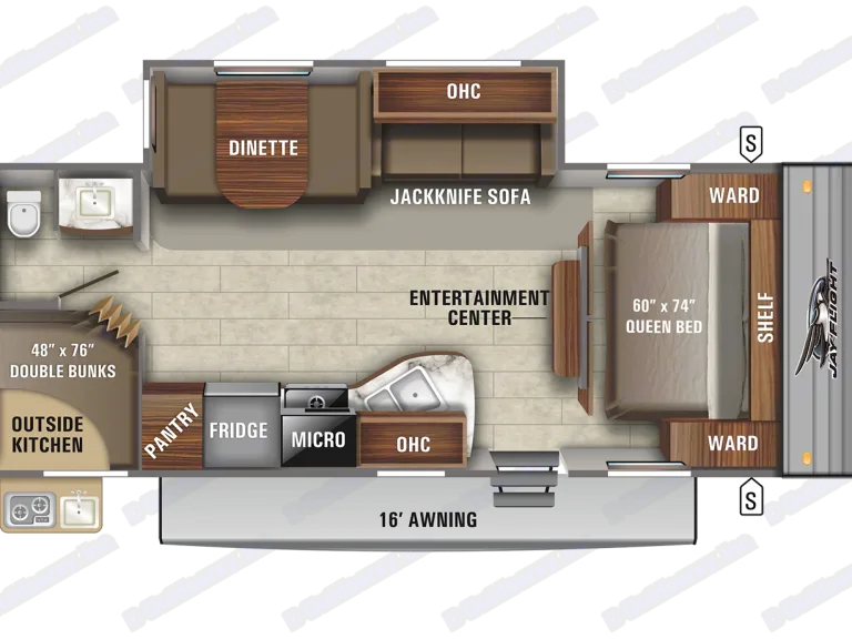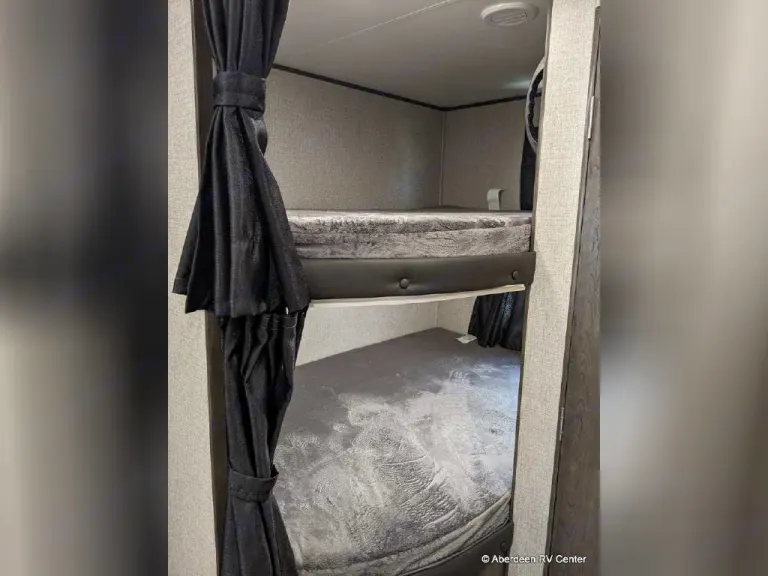 This Jayco travel trailer is a lighter weight trailer with bunkbeds and a nice slide that is great for just a couple or a group of 5-6 people. With the foldout dinette and sofa, you might be able fit a few extra kids! This even has an outside kitchen!Beds