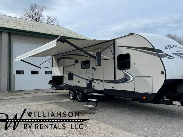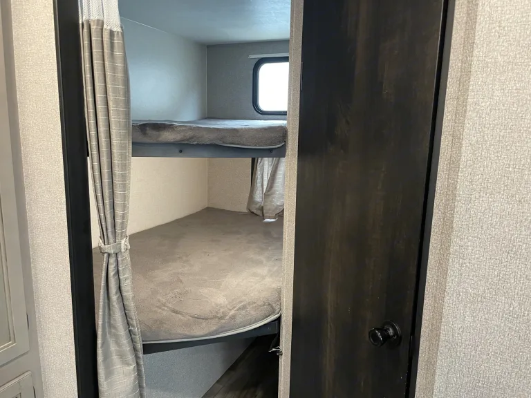 This Starcraft 30 ft trailer is a great size trailer with bunkbeds that is fits just a couple or a group of 4-6 people. With the foldout dinette and sofa, you might be able fit a few extra kids! It also has an outside kitchen for an added bonus!Beds