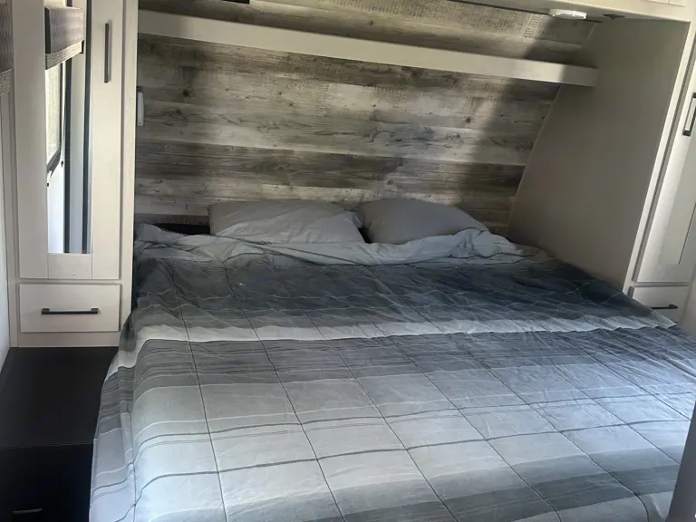 Camp in Comfort.Sleeps 7 comfortably (King bed + Double queen Bunkbed and a fold down couch.What's includedFully equipped kitchenette (stove, microwave, fridge)