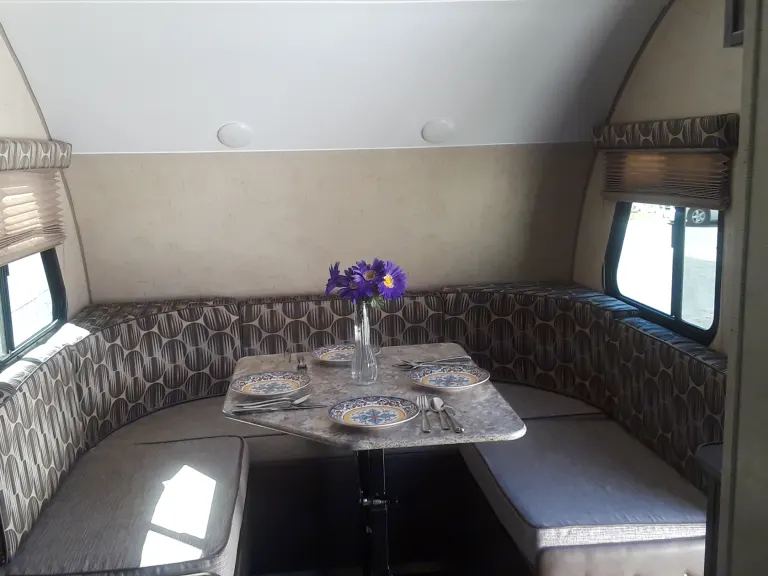 Kitchen utensils, setting for 4, Coffee kettle, Cooking utensils, pots and pans Detergent sponge Roll of Napkins(Swiveling arm TV/DVD accommodates bedroom/dinette areaIndoor/outdoor speakers Bluetooth CapableBathroom w/ Shower Toilet Sink