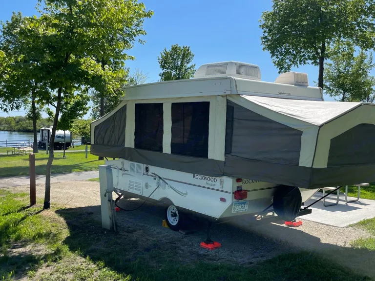 Enjoy our Rockwood pop-up camper, an ideal trailer for your family camping adventures. Equipped with a stovetop & mini fridge, & also comes with a portable grill with grilling utensils! It is easily tow-able with a pickup or smaller SUV. One full bed in the front with a twin in the back & also includes a dinette sleeping option to comfortably sleep 5. Recent updates include, freshly painted cupboards, new flooring, recovered cushions, new foam mattresses and covers. Your rental includes: cleaning wipes, paper towels, paper plates, silverware, broom, & water hose.