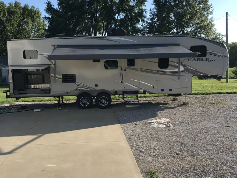 Fifth wheel with Anderson Gooseneck Hitch, all the amenities of home. Bunk room with 4 bunks for kids, kitchen table and leather couch fold out to beds, nice queen master bedroom sleeps up to 10 and large bathroom with large shower. Exterior has a outdoor kitchen with stove top, refrigerator, and television.