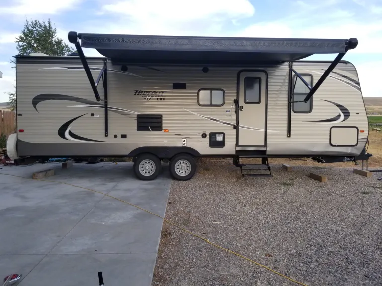 2016 Keystone Hidout fully stocked with pots and pans cups plates silverware sheets comforter towls outdoor table and chairs.