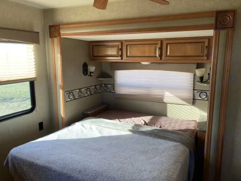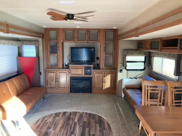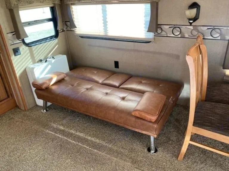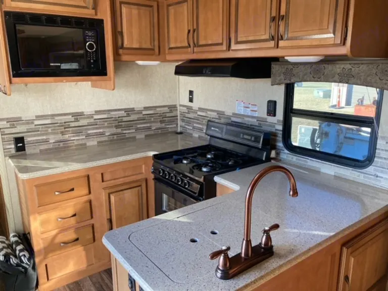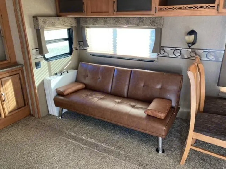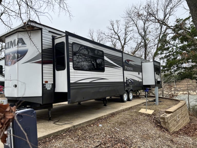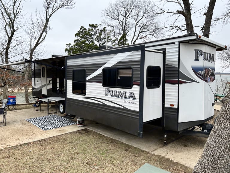 2016 puma by palomino 39' camper.What's includedThe camper comes with fresh linens and towels, a queen size blow up mattress for more sleeping area in the living room, 2 corn hole boards and 2 plastic tables for outdoor use. There is basic cookware provided. Delivery is available.Other things to noteNo smoking and no pets please.
