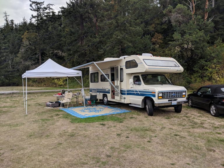 Drop off time - 3pm or before (flexible for 2 hours late return if available without late fees). $50 for every two hours thereafter if available.Waste water and toilet dump tanks must be dumped before return, otherwise $100 dumping service feeWhat's includedDishes, flatware, pots & pans, kitchen utensils, drip coffee maker, paper towels, cleaning products, garbage bags, extra outdoor propane burner and small table. 4 Camp chairs, ladder ball & spike ball games up top. Board games under the bed. Books and DVDs for rainy days!Other things to noteRefrigerator requires electricity or generator to run.Awning is not accessible .