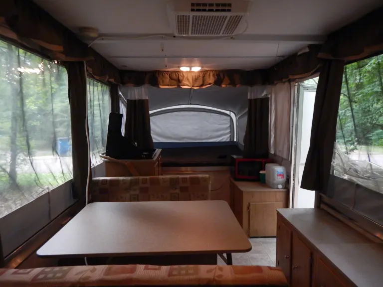 Easy to put up, clean tent trailer with AC, stove, small frig, microwave, two soft beds (one king mattress and one queen mattress).. small dining table also folds down into bed. all you need for a comfortable camping trip. We have pulled this trailer with our van. It is easy to set up and we can walk you through all of the steps. Comes with one big pot and one big pan. If you want to pick up or drop off outside of the times set just let me know. As long as no one else is waiting for the trailer we are flexible