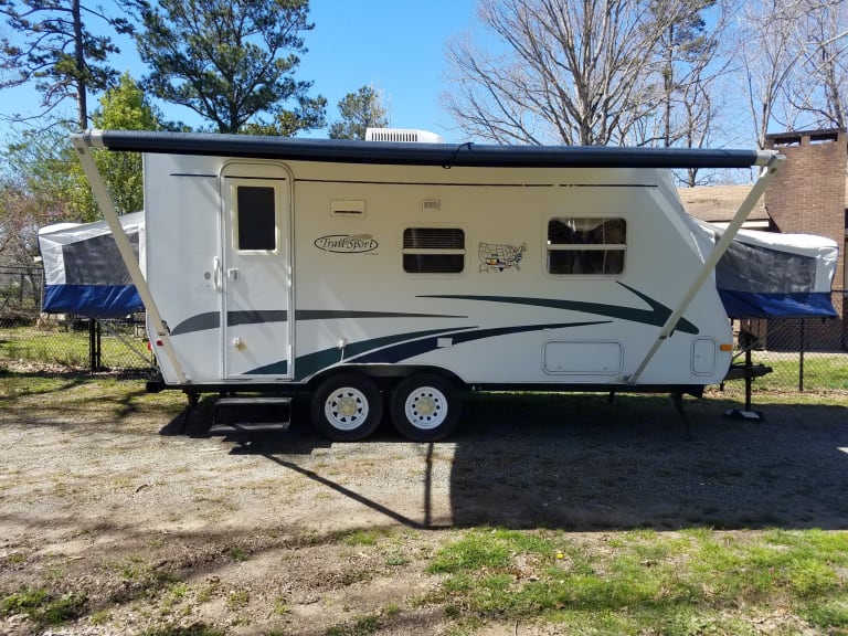 Our 2006 Trail Sport Hybrid is compact for easy towing, roomy inside with one queen bed, one double bed, fold down sofa, sink, three burner stove, exhaust fan, microwave, stereo, fridge, bath, dinette and awning. We provide bed linens, kitchen and bath towels, cookware, dinnerware, utensils, TV/DVD player, Keurig and more. Great size for most campgrounds the hybrid camper gives you the best off both worlds, tented beds are great for enjoying the night sounds while drifting off to sleep, while having the room and amenities of a camper and no need to sleep on the ground. Glamping on the go. An inventory list will be provided when reserved. Stove and hot water heater run on propane, propane tanks are supplied but not filled.
