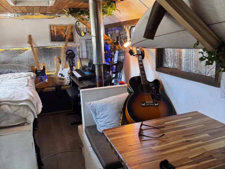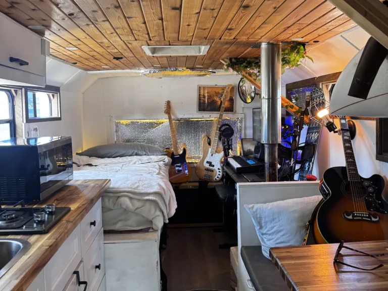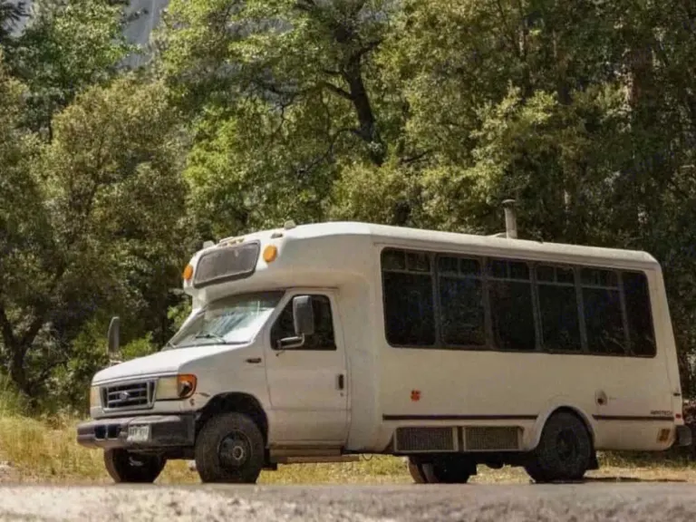 This is not your average camper, it’s a converted Ford E-450 shuttle bus turned into a rolling tiny home. At about 25 feet long, it’s roomy enough to feel like an apartment on wheels but still easy to drive and park.Inside you’ll find everything you need to live comfortably on the road:
