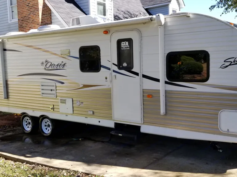2016 Shasta Oasis 310K Travel Trailer with 18 inch slide. Full galley kitchen with a 3 burner cooktop, residential 60/40 sink, 6ft cubic refrigerator, and a 6 gallon DSI water heater. Pass-through storage and front diamond plate rock guard. Rear bunk room with one bunk at 38x74 and 2 bunks at 28x74. Interior lights have been upgraded to LED bulbs. Outdoor kitchen features a tall mini-fridge, counter space, cabinets, and a sink.