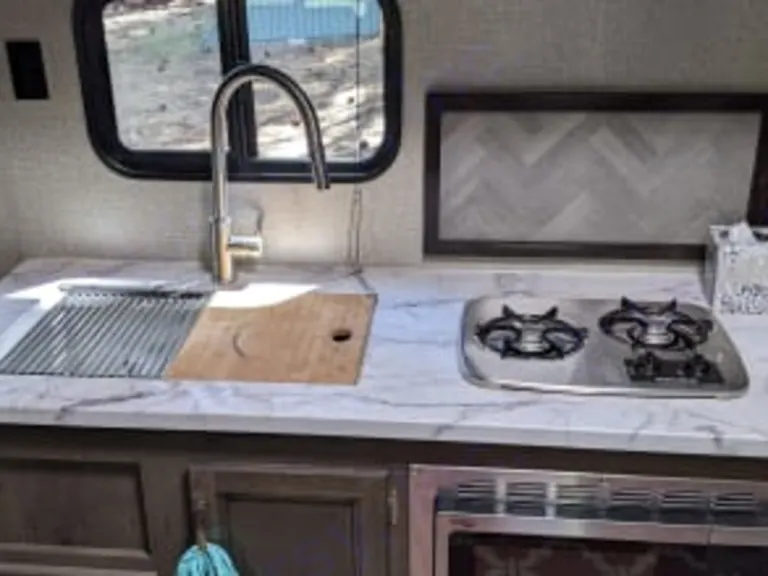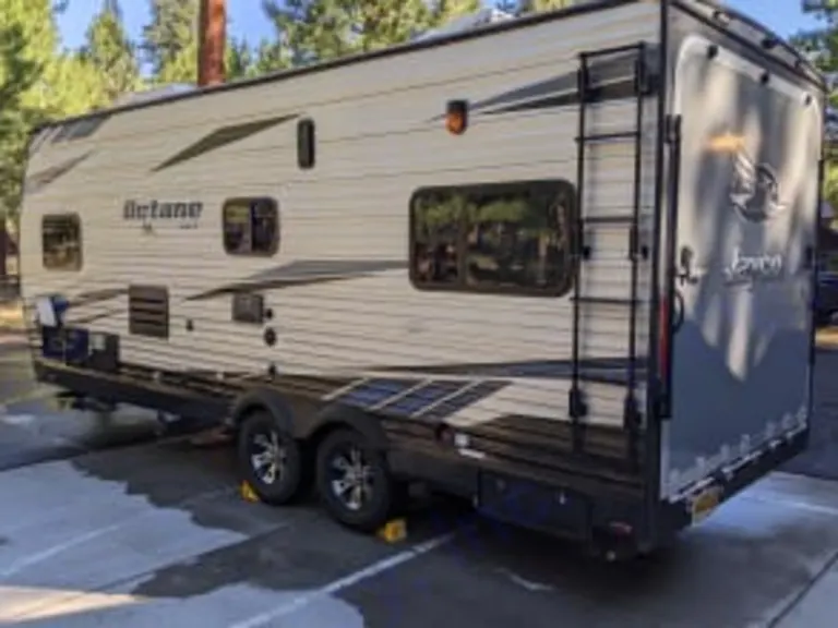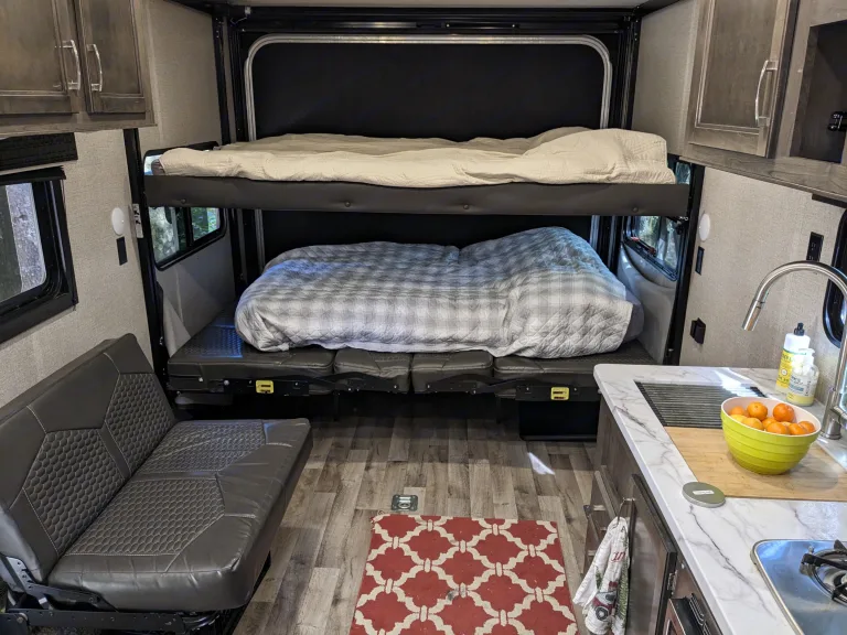 Easy to tow with a half ton truck and room for the toys and the family. A front queen bed and queen bunk beds in the back that raise up to make room for ATVs or other toys. Two burner stove, microwave, large fridge and freezer, bathroom big enough for a 6'4" guy to maneuver in easily and an outdoor shower. It's a perfect trailer for a family of four to six. Small inside dining area or make it larger by raising the bunks and using the booth seating. What's includedComes with all the kitchen gear you need. Comes with mattresses but no bedding. Other random camping gear can be added for small extra charge.