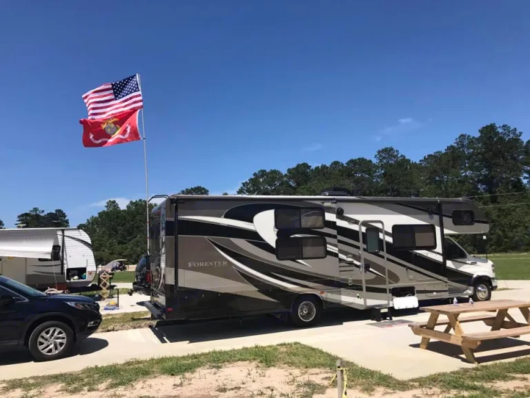 31 ft RV w/ Bunk House. This RV is great for a family vacation w/ lots of bed space and plenty of storage. Relax under the awning or inside with the AC. 3 Flat screen tv's with dvd players inside and flat screen TV outside. Master bed room has a walk around queen size bed with privacy. Bathroom has its own door for added privacy from master bedroom. Full kitchen with stove and microwave all kitchen utensils included. RV has automatic levelers and 2 slides so you and your family can be setup within 5 minutes.
