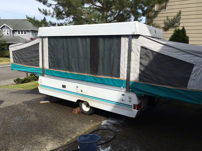 Great tent trailer. Sleeps 5 on one queen-size and one double bed plus couch that turns into bed. Has electric water pump with five gallon storage. Gas heater. Indoor and outdoor gas cooking surfaces.