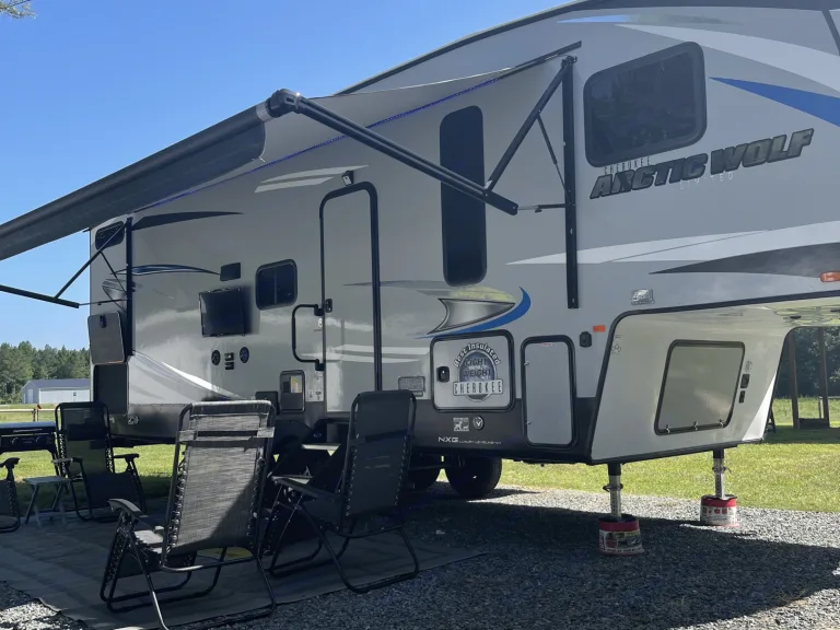 This Cherokee Arctic Wolf bunkhouse fifth wheel will have your family enjoying each camping trip you take. With double slides for added space, an outdoor kitchen, and inside residential refrigerator, you will easily want to stay a little longer when you travel!Enter and find the kitchen area to your left. There is an angled counter with large single sink, a three burner range with overhead microwave oven, and residential refrigerator w/1000w inverter in case the power goes out. Plus you will find ample storage in the overhead cabinets, and the storage hutch along the interior wall. When meals are prepared you can sit down and enjoy them at the booth dinette slide out. Here you will also find a tri-fold sleeper sofa for added seating and sleeping space if needed.Opposite the road slide, next to the refrigerator, you will see that there is an entertainment center where there is a TV for your viewing pleasure.Along the rear wall there are bunks for the kiddos, and a wardrobe for your clothing and things. Notice the handy step up in the rear for easy access to the top bunk. You also have a curtain that can be pulled for more privacy at night.Up front, to the right of the entry door, take the two steps up to a front master bedroom and bath. The bathroom is the first door on your left. Here a corner shower, toilet, and sink are found in a spacious room with a second door that slides open allowing easy access to a slide out linen/wardrobe in the bedroom.The bedroom features a Comfort Power Master queen bed lift system with a nightstand on either side, plus a slide out wardrobe/linen cabinet, and so much more!You will also love the auto leveling system and the outdoor entertainment (tv hookup, outdoor speakers)! What's includedIncluded is fresh linens, 3 tv’s (bedroom, living room, outdoor) cooking/eating utensils, outdoor black stone flattop grill, 4 gravity chairs, and exterior rug