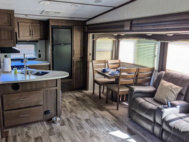 Spacious 3-slide & comfortable 5th wheel with double-slide large living area, two recliners, pullout couch, fire place, open kitchen. Great space to hangout on a rainy day. Walk-in, glass door shower in bathroom. Outdoor gas grill and fridge, perfect for hanging out under the large awning. Outdoor TV for watching the game by your fire pit, or turn on some outdoor music for a relaxing night. Queen bed is an after market memory foam, with black out curtains in the bedroom. Bring Fido with you for the family fun! Questions? Just ask!Interested in camping in Hard Labor Creek? The delivery fee of $50 includes set-up!What's includedBed sheets, pillows, throw blankets, small charcoal grill, gas grill, grill utensils, outdoor rug, coffee maker, kitchen supplies.