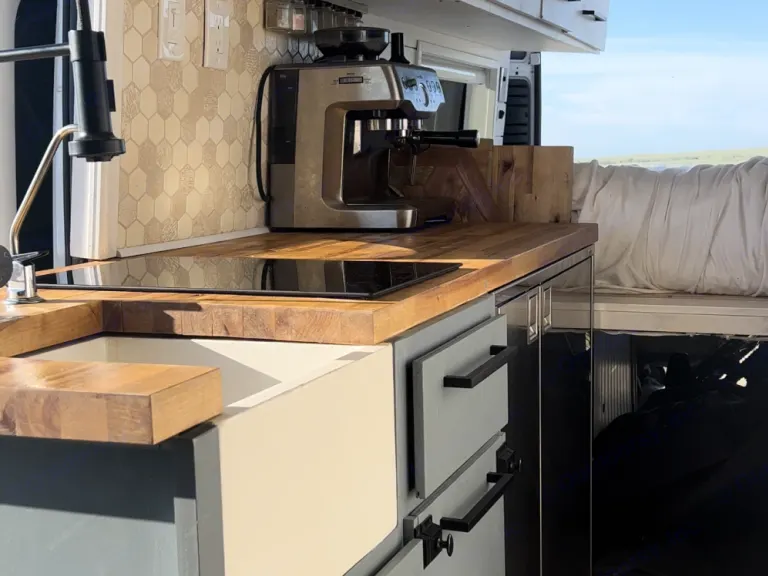 Beautifully finished self converted camper van. Queen sized lofted bed, large trunk space, indoor shower, outdoor shower, large fridge, two burner induction cooktop, large sink, bike rack, roof rack, heated floors, gas heater, hot water heater, AC unit, 870AH of lithium ion batteries, 3000W inverter, 400W solar, 100A alternator charging.Watch a full van tour here -> https://youtu.be/PlFkAt7Sxsk** newly installed swivel seats!What's includedLinens, two camp chairs, pots and pans, bowls, cups, silverware, spices, towels, cleaning supplies, Espresso maker, toilette paper ect. If there is something you want on your trip let me know! I am happy to work with you to make sure you have everything you need.RecommendationsComplete self contained camper van can be taken anywhere! Large battery system and alternator charging allows you to boondock for long periods. I recommend the Inyo national forest for great remote camping. Let me know if you want to chat and help plan your trip!