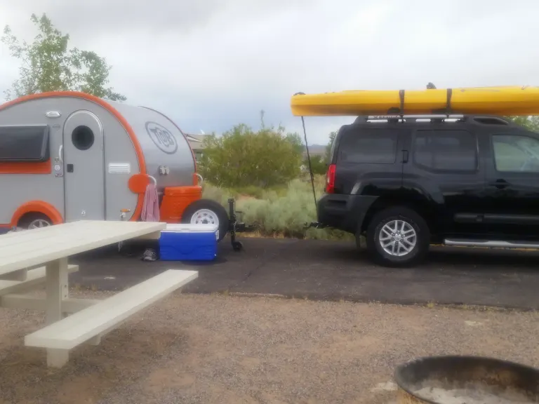 Like traveling light with Rockstar status. This little trailor for two will go easy on the gas while providing all the essentials! Not good at backing up a trailer - no problem, just unhitch and push or pull into place. Yes, it's that easy! King sized bed, sink, stove, refrigerator, air conditioner, radient heat, TV, stereo, solar input.