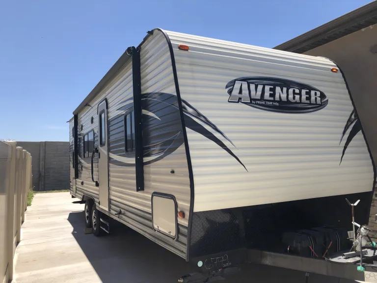 2017 Prime Time Avenger in exceptional condition! Has two extra large bunks, a queen size be with privacy door, TV and DVD player, sound system that will play outside, Leds on the mechanized canopy, and can sleep a total of 8 when using the futon and eating area.
