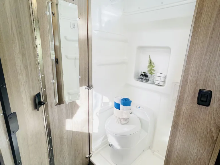 — Cozy, enclosed bathroom with toilet, full mirror, hot shower, and perfect for hanging wet gear.