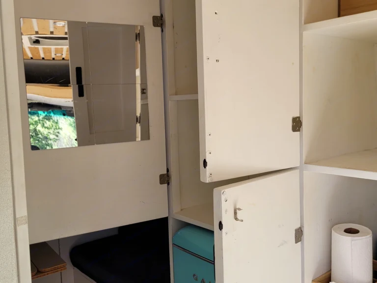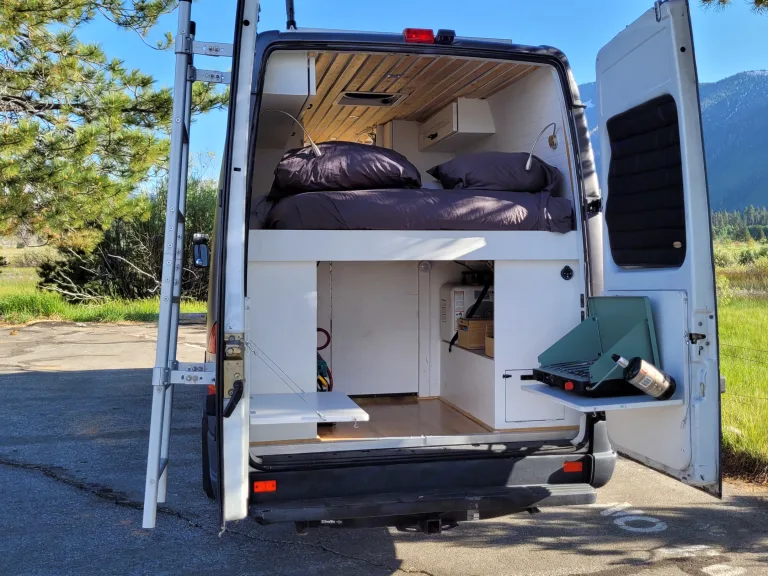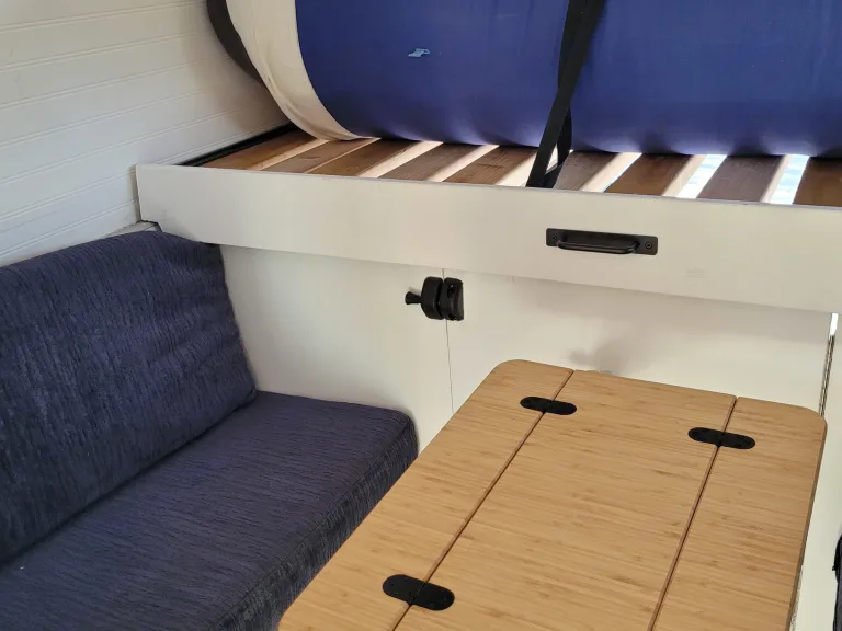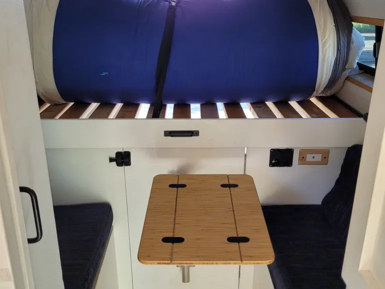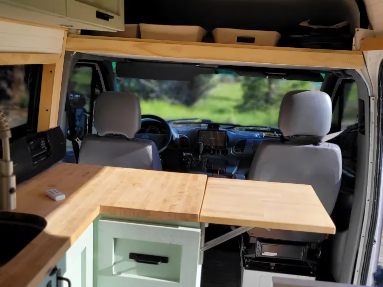 Full organic mattress (not memory foam)Swivel driver & passenger seats + dining/work areaPlenty of built-in storage for clothes, food, and gearKitchen Features