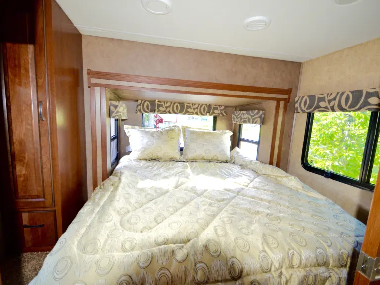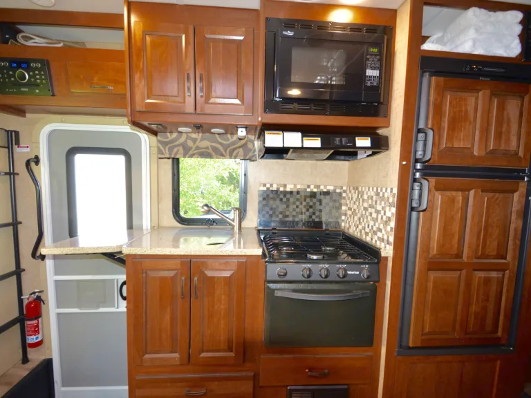 The kitchen is very functional with plenty of storage. There is also a gas grill that plugs right into the RVs propane. You can be set up and grilling in minutes.