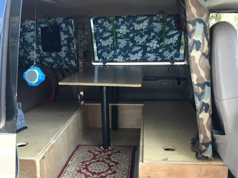 I used to work at a camper van company and got this baby from the camper van company I used to work for the van bed box turns into a table and has storage underneath I have a tablet for movies and a Bluetooth speaker for music And a fan And refrigerator To keep you nice and cool and hydrated comes with a bike rack in back And have access to loaner bikes